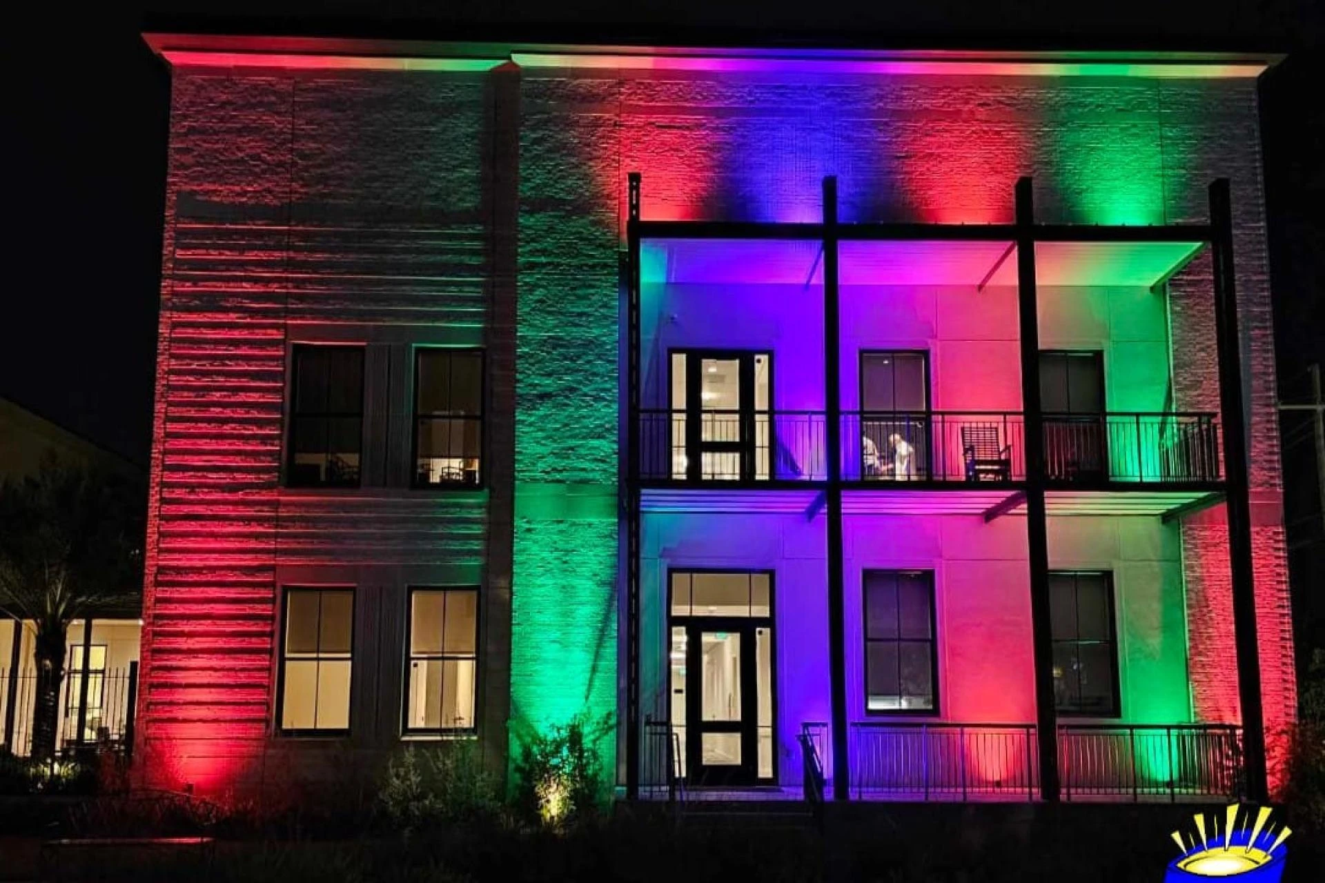 - Wall-mounted LED fixtures highlight signage from a distance.