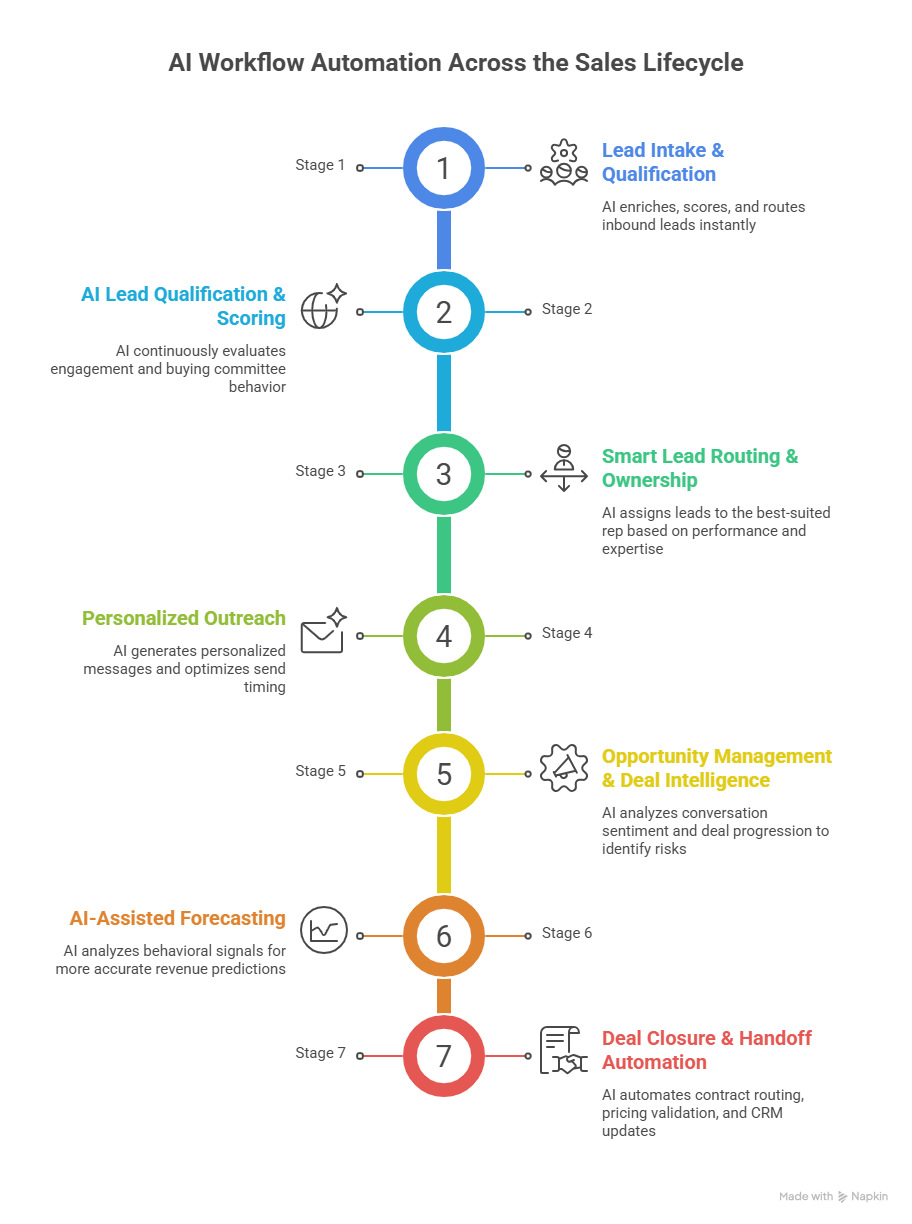 AI workflows can automate lead enrichment, scoring, routing, outreach personalization, opportunity health monitoring, forecasting, approvals, and post-deal handoffs.