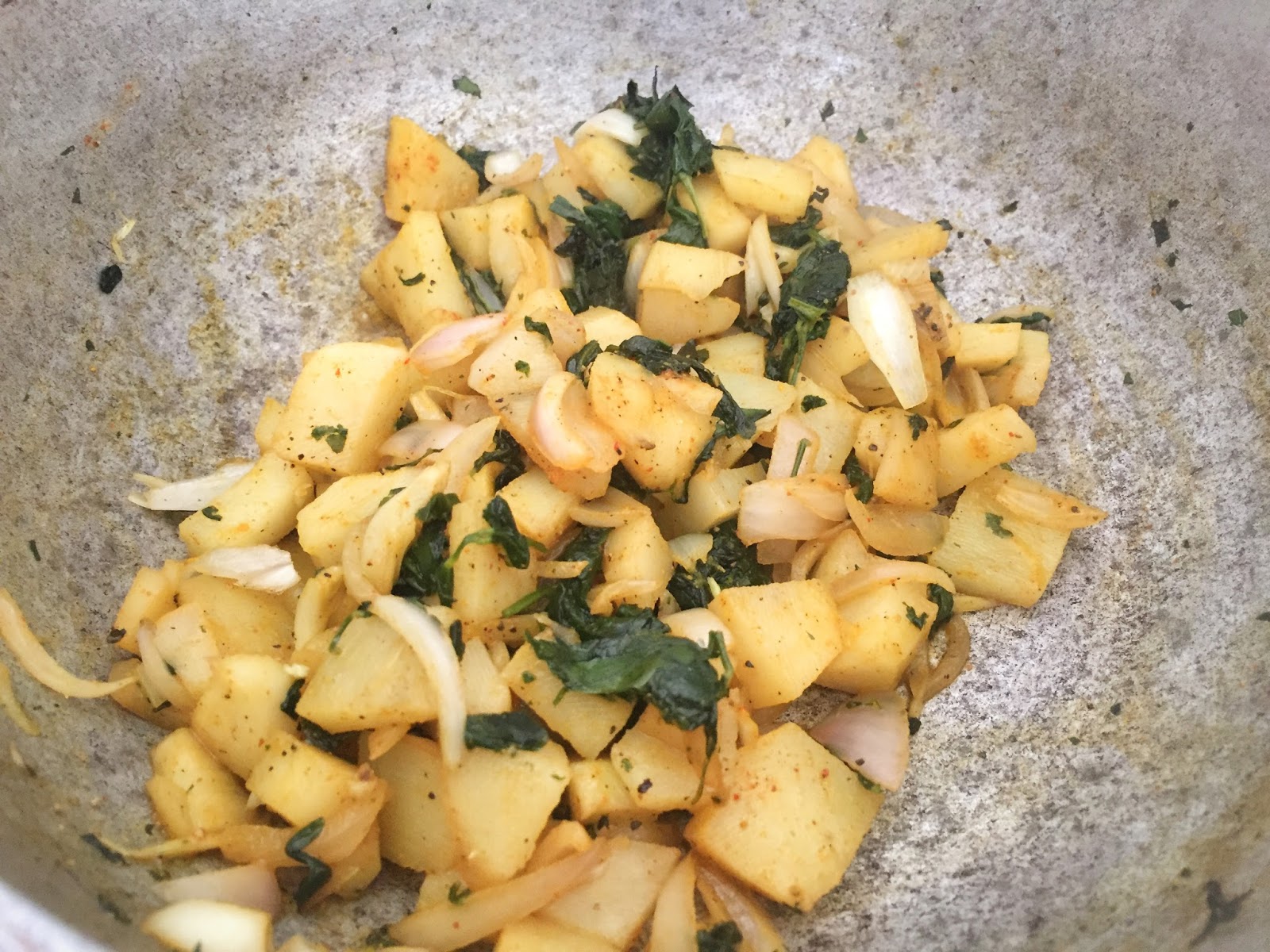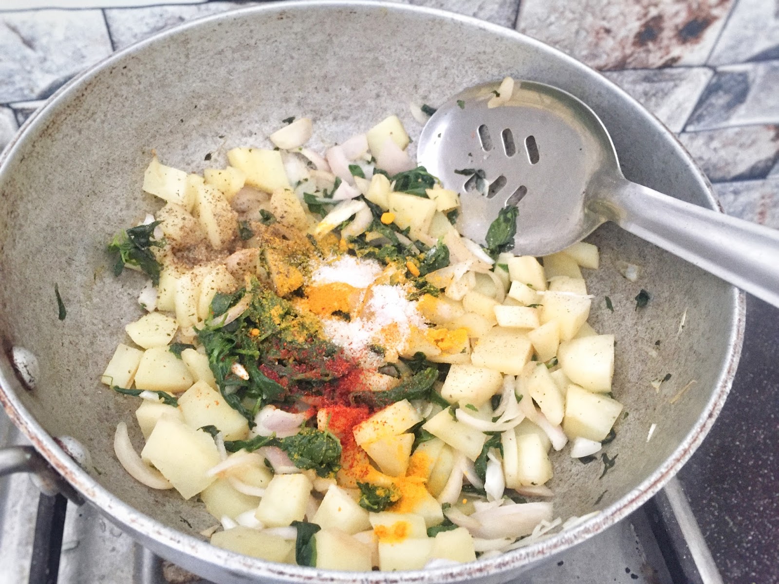 1 small bowl chopped potato1/2 small bowl chopped onions1 small bowl methi1/2 tsp cinnamon powder2-3 cloves of garlic1/4 small sized grated gingerSalt as per taste1/2 tsp pepper1 tsp turmeric powder1 tsp olive oil