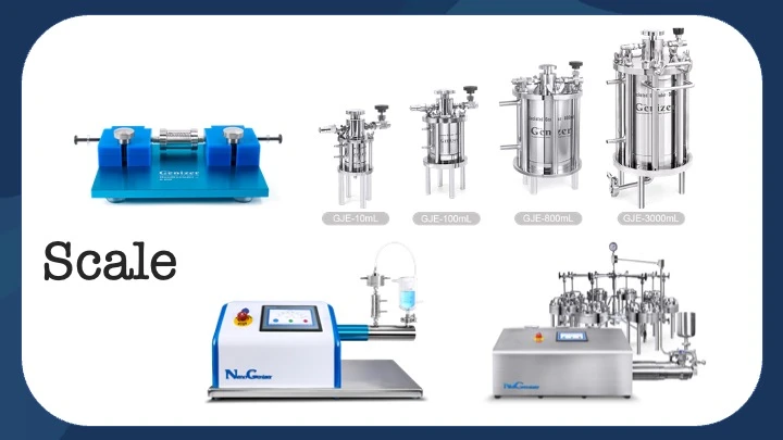 Genizer provides solutions for nanoemulsions, suitable for batch preparation from 25mL to 10L, or continuous manufacturing from 10mL/min to 20L/hour.