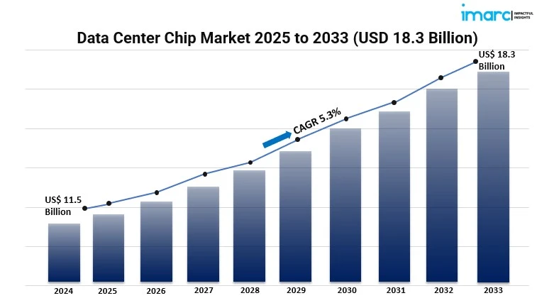 The global data center chip market size reached USD 11.5 Billion in 2024. Looking forward, IMARC Group expects the market to reach USD 18.3 Billion by 2033, exhibiting a growth rate (CAGR) of 5.3% during 2025-2033.