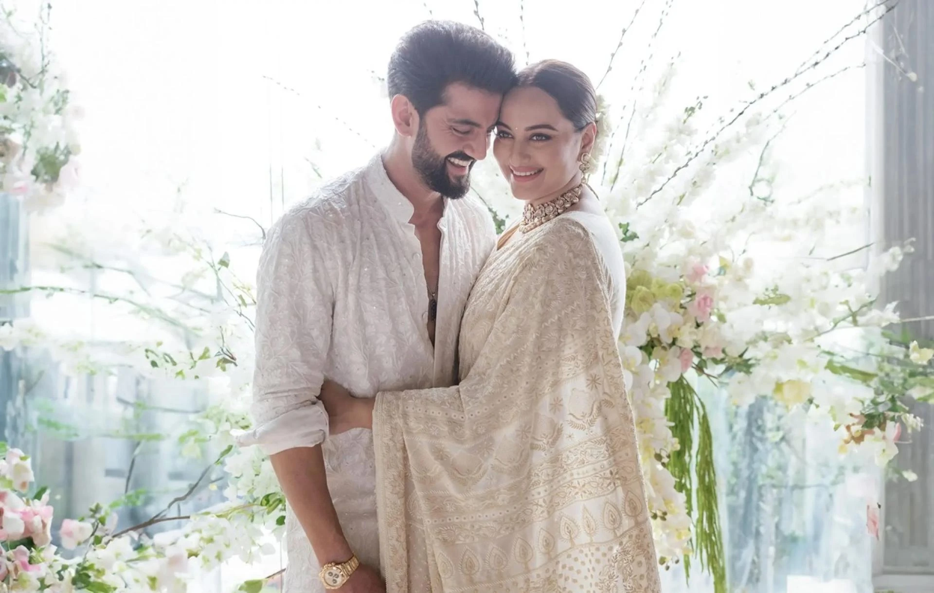 Sonakshi & Zaheer's wedding! Timeless ivory saree & Red Banarasi. See their looks & find wedding fashion inspiration for brides & grooms. Shop S…
