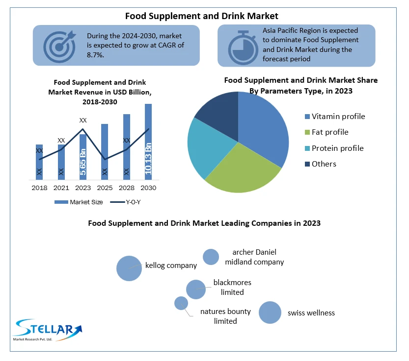 The Global Food Supplement and Drink Market size was valued at USD 5.65 Bn in 2023 and is expected to reach USD 10.13 Bn by 2030, at a CAGR