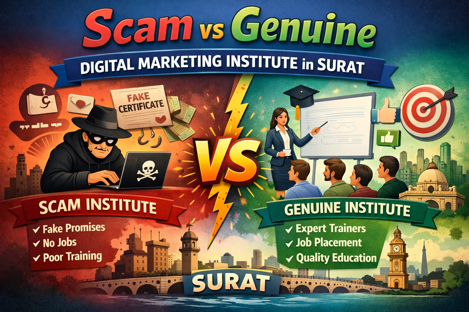 Choosing the right digital marketing institute in Surat can be confusing, especially with so many options available. This blog explains how to differentiate between scam and genuine institutes by analyzing course content, trainer expertise, placement claims, and practical training. It also highlights common red flags students should avoid. If you want to invest wisely in your career, this guide will help you make an informed decision.