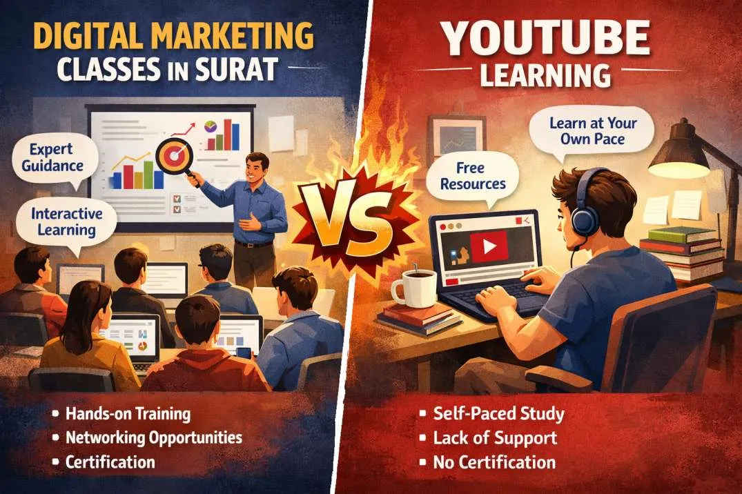 Confused between learning digital marketing from YouTube or joining digital marketing classes in Surat? This blog compares both options in terms of structure, practical exposure, mentorship, and job opportunities. It explains why structured learning often leads to better career outcomes while free resources can lack direction. If you are planning to build a serious career in digital marketing, this guide will help you choose the right learning path.