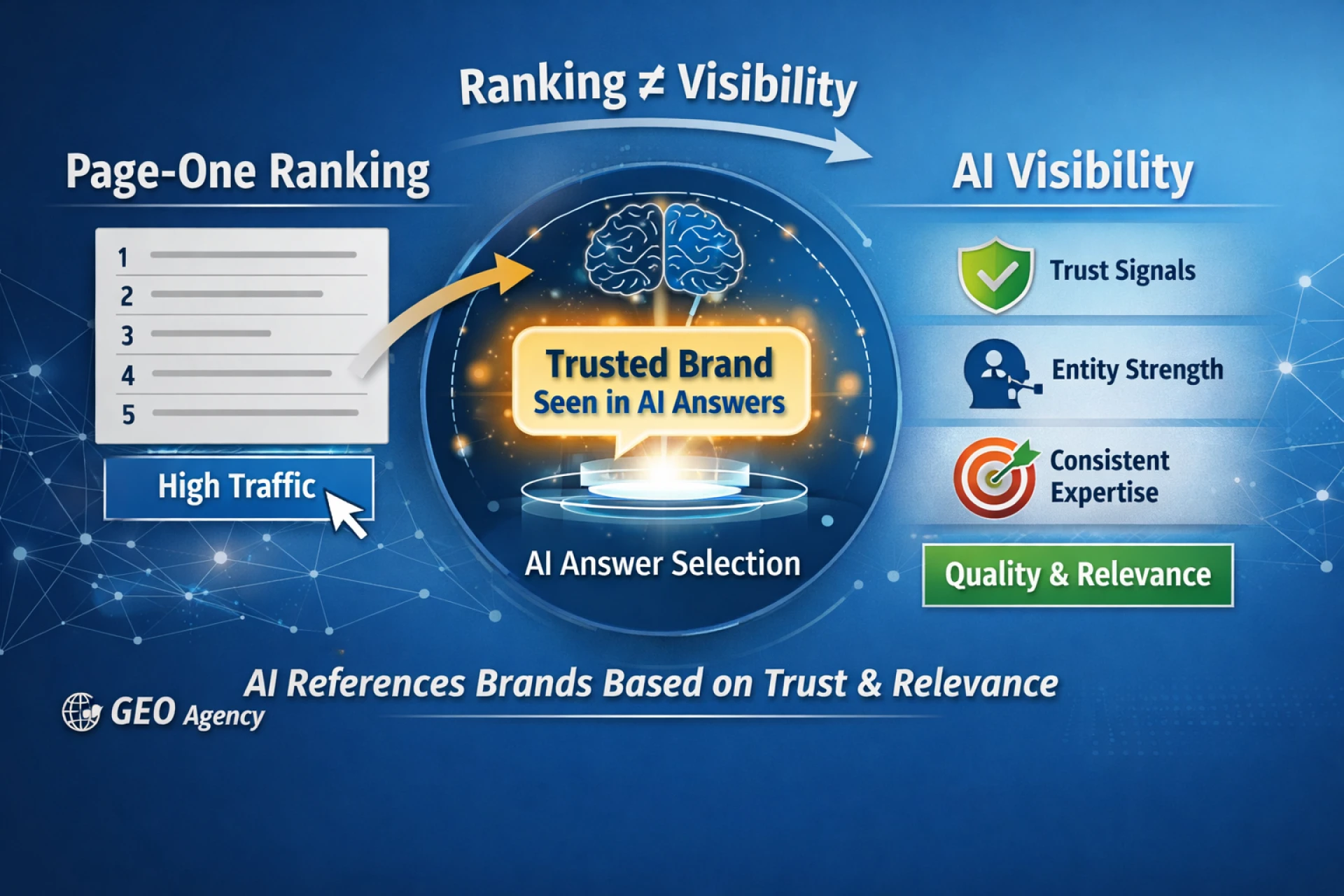 AI visibility isn’t just about ranking on page one. Brands with consistent expertise, strong entity recognition, and clear content can appear in AI answers even without top search positions. Explore how AI selects sources, why trust matters more than traffic, and how working with a geo agency or generative engine optimisation service can give your brand an advantage.