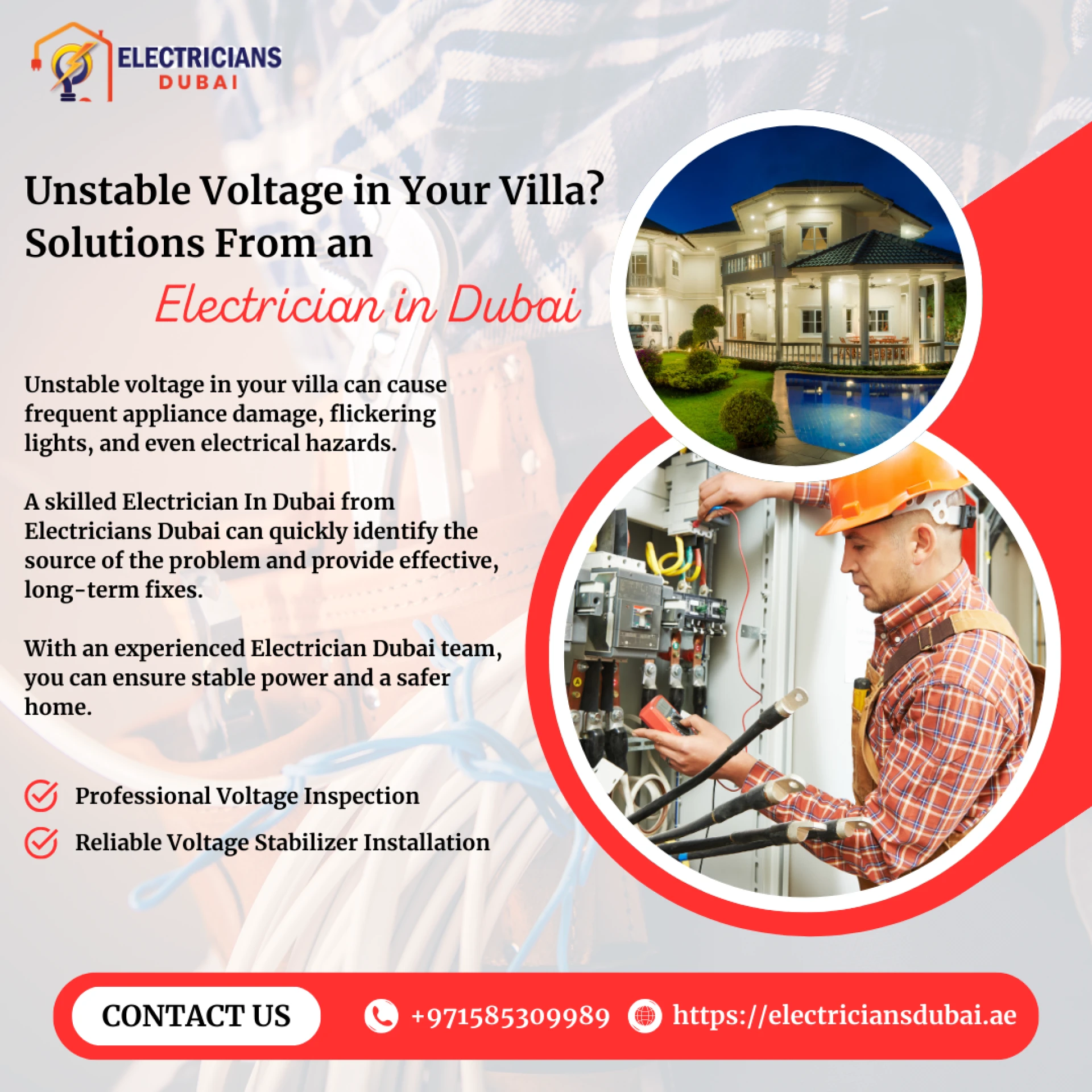 Experiencing flickering lights or voltage drops in your villa? Discover expert solutions from a trusted electrician in Dubai. At Electricians Dubai, we provide reliable services like Electrical Sockets Installation Services Dubai, Electrical Rewiring Services Dubai, and more to keep your home safe and powered.