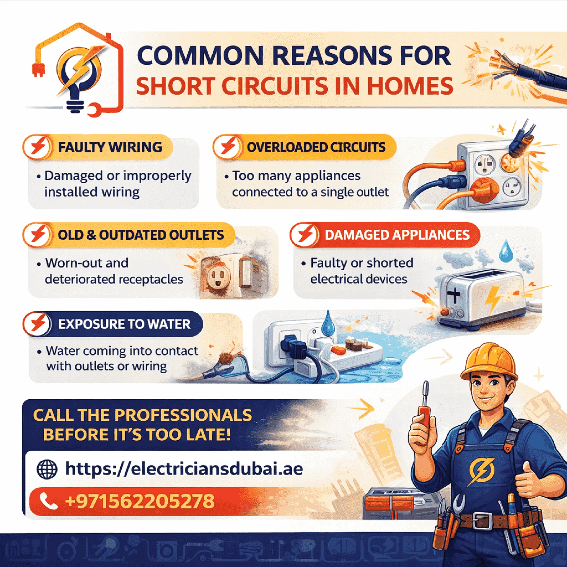Be informed of the most common occurrences of electrical short circuiting in homesteads. Electricians Dubai professional Electrician In Dubai offers advice on safety and Electrical Rewiring.