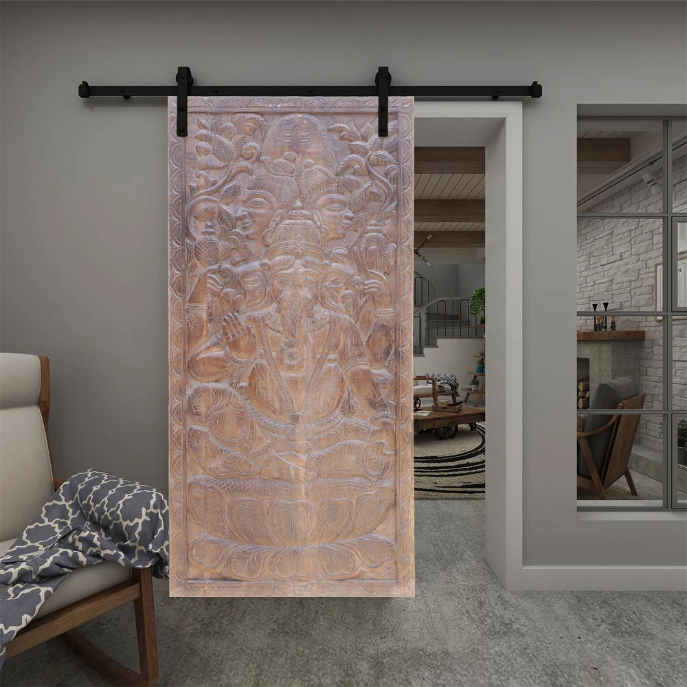 Resort-style themed decor with carved barn doors offers a luxurious yet grounded ambiance. Featuring the Antiqued Fluting Krishna with Cow, a vintage