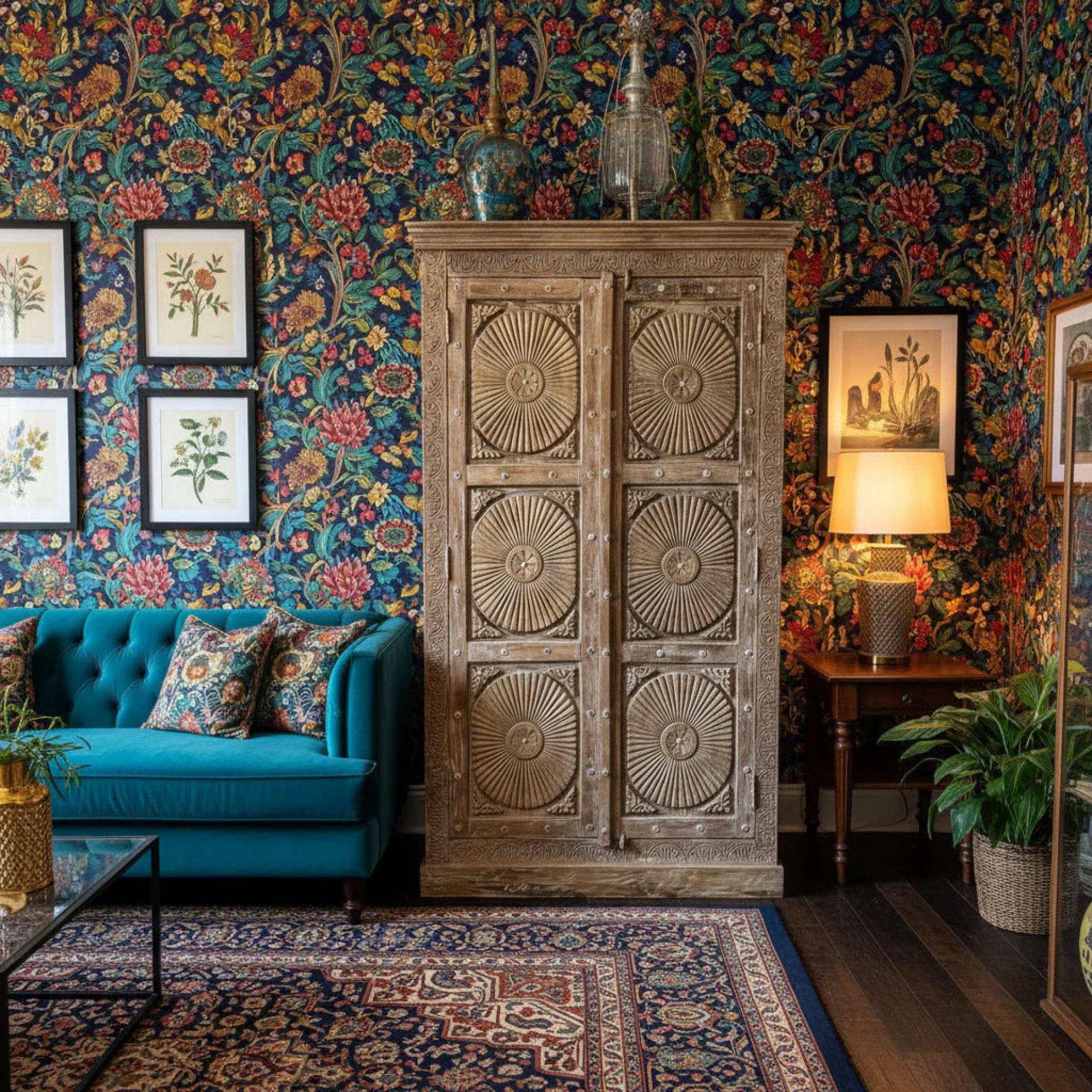 Home-decor Bohemian Maximalism and the Presence of a Vintage Carved Armoire