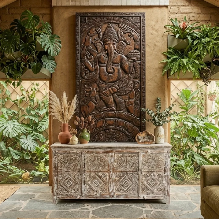 Vintage carved wood doors and accent furniture bring a sense of character and timeless elegance that few modern pieces can replicate. Rooted in tradit
