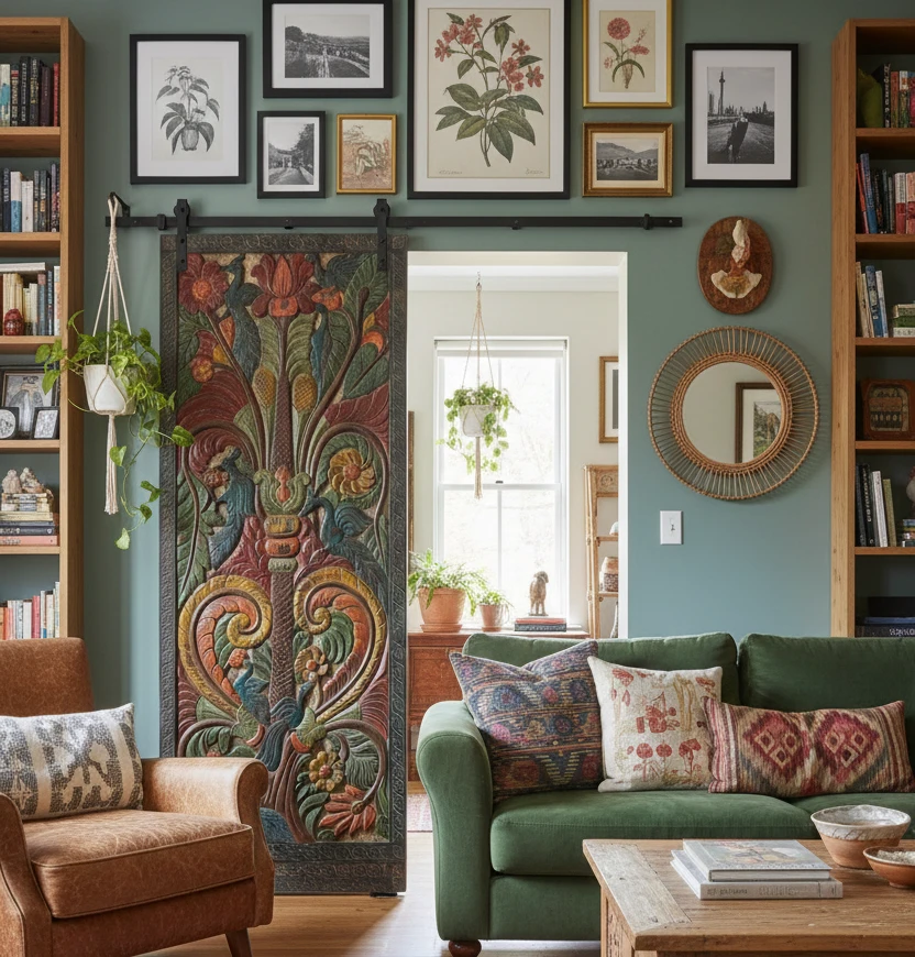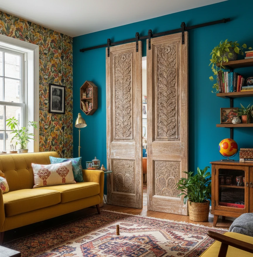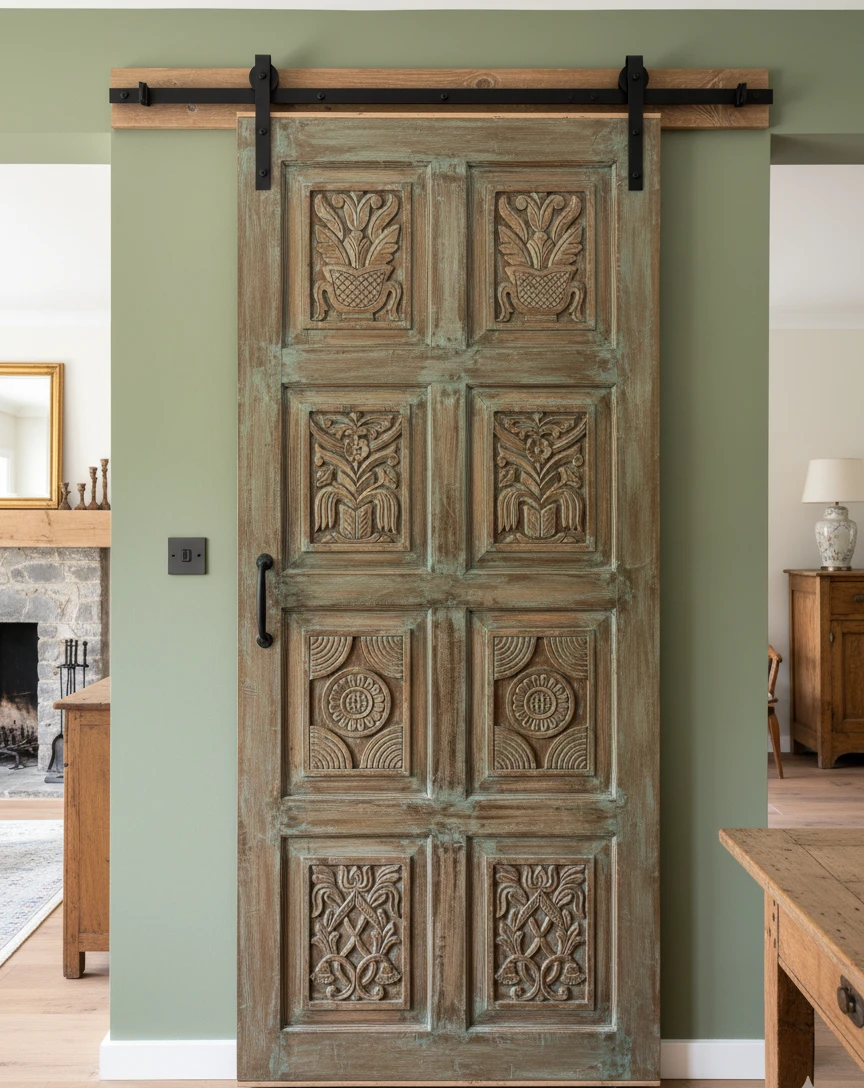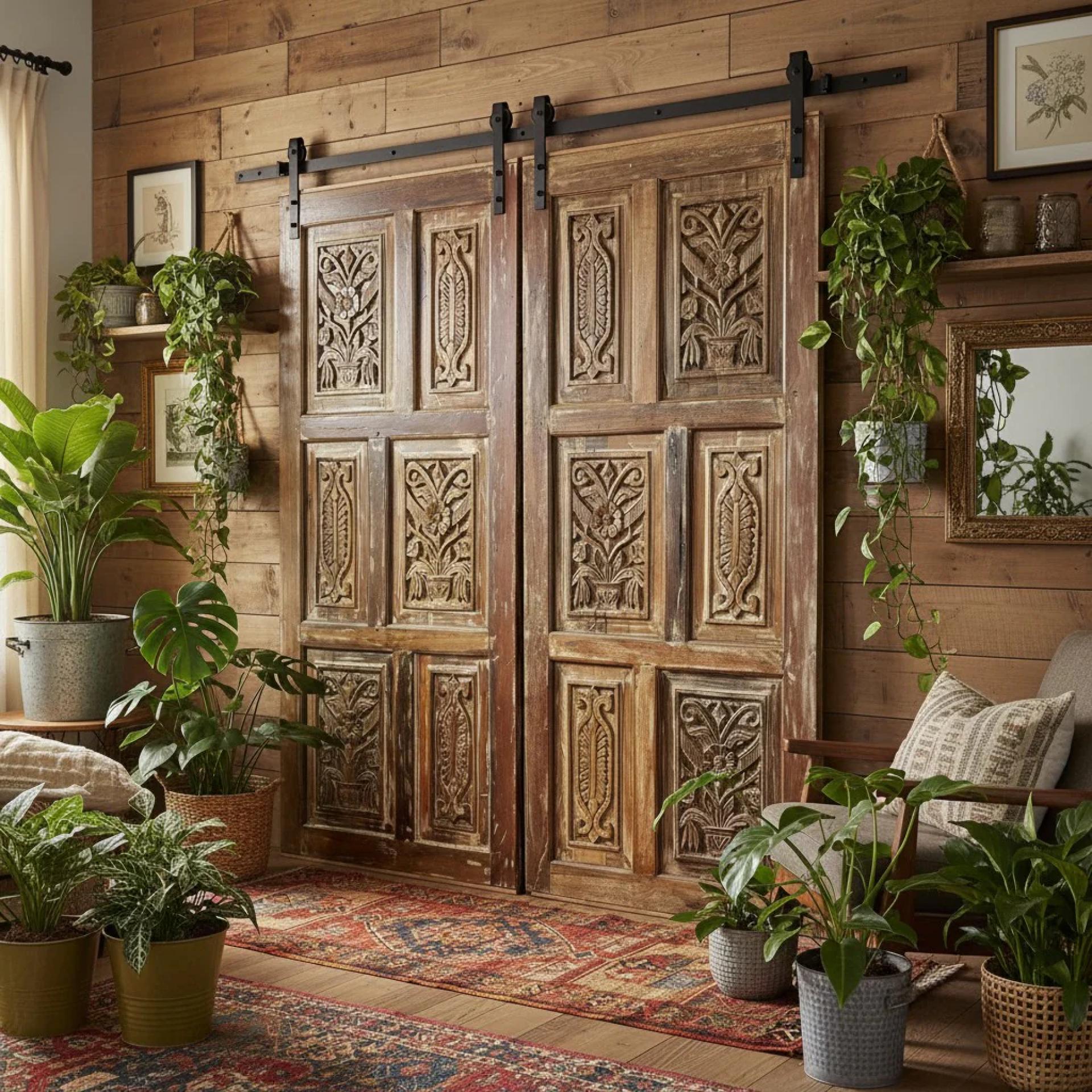 For a mid-century farmhouse look that incorporates carved barn doors from Mogul Interior, think about creating a space that balances rustic warmth wit