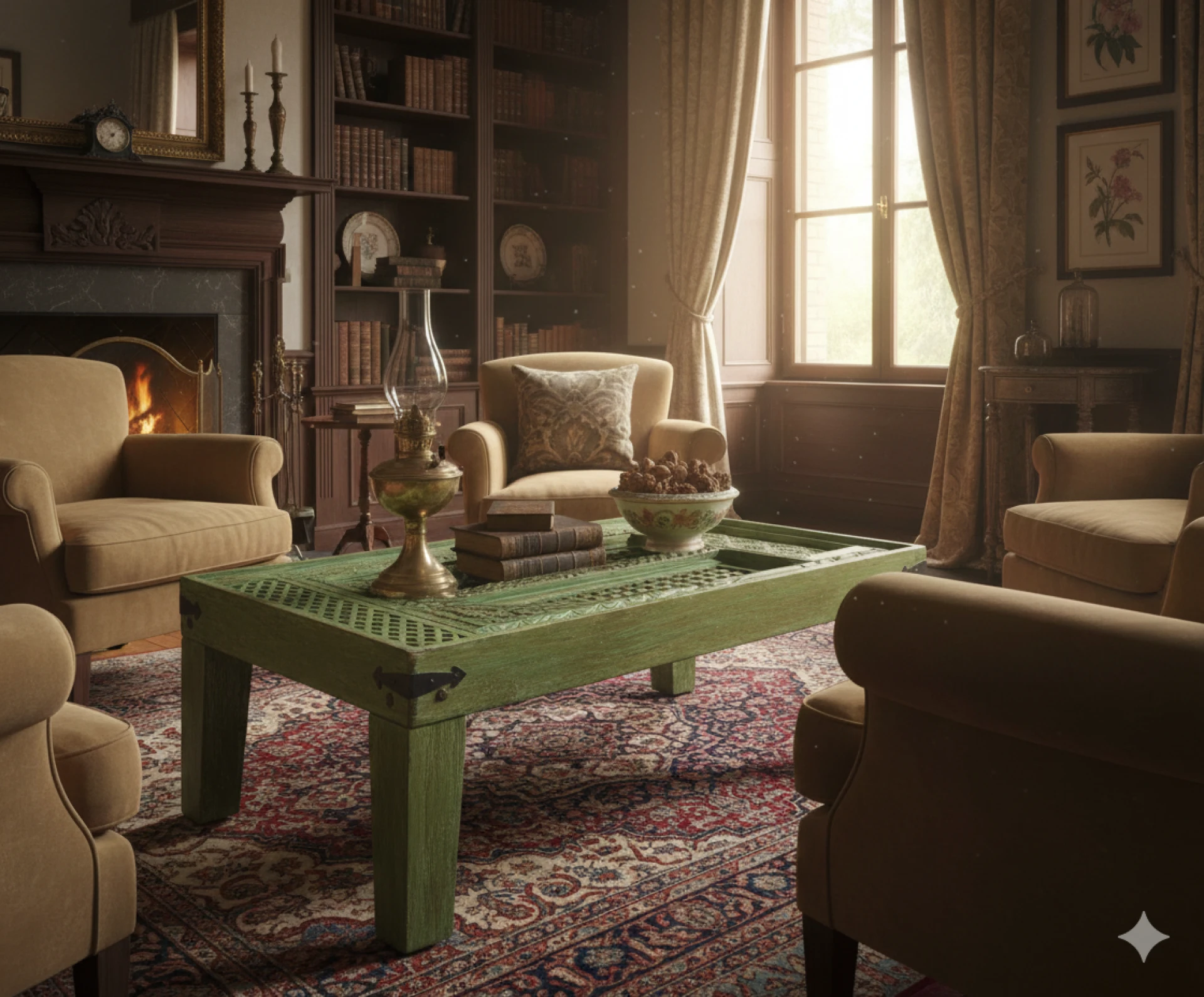 Vintage carved wood doors and accent furniture bring a sense of character and timeless elegance that few modern pieces can replicate. Rooted in tradit