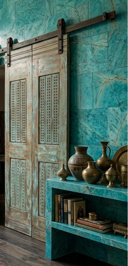 Antique Indian doors and carved furniture bring a quiet sense of history into a home — the kind that feels collected rather than decorated. Each wea