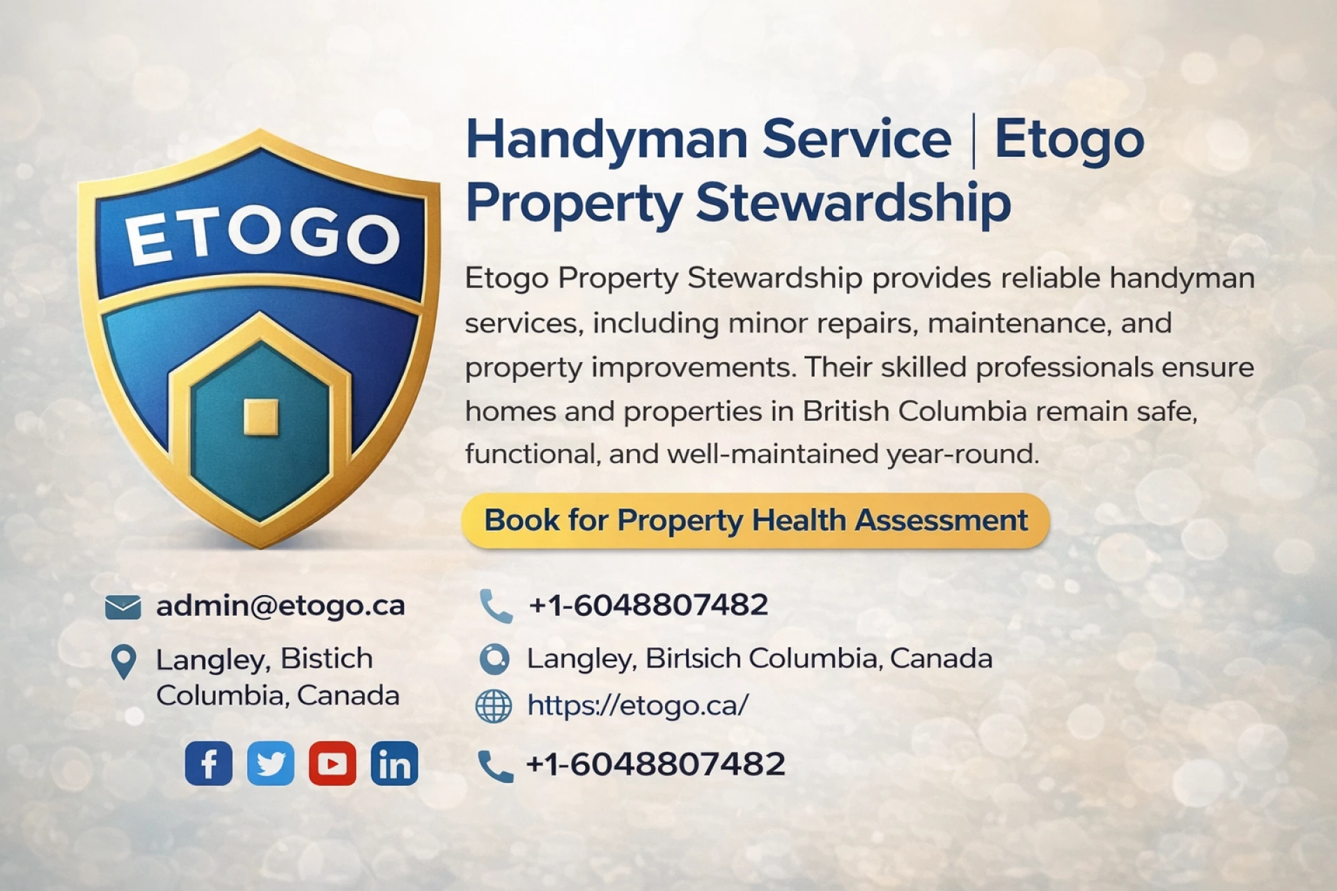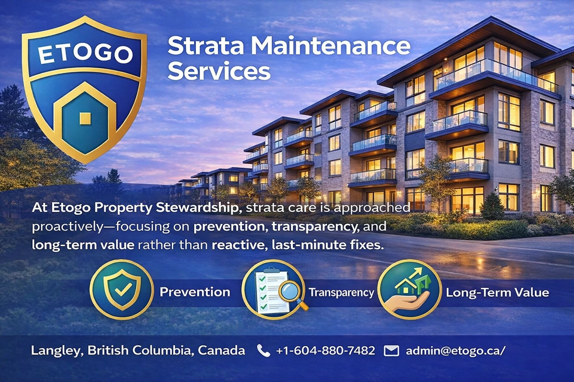 Etogo provides proactive property stewardship, preventative maintenance, rental turnover repairs, and property health assessments for homeowners, landlords, and strata in Langley and the Lower Mainland, BC. Prevent costly emergencies before they happen.