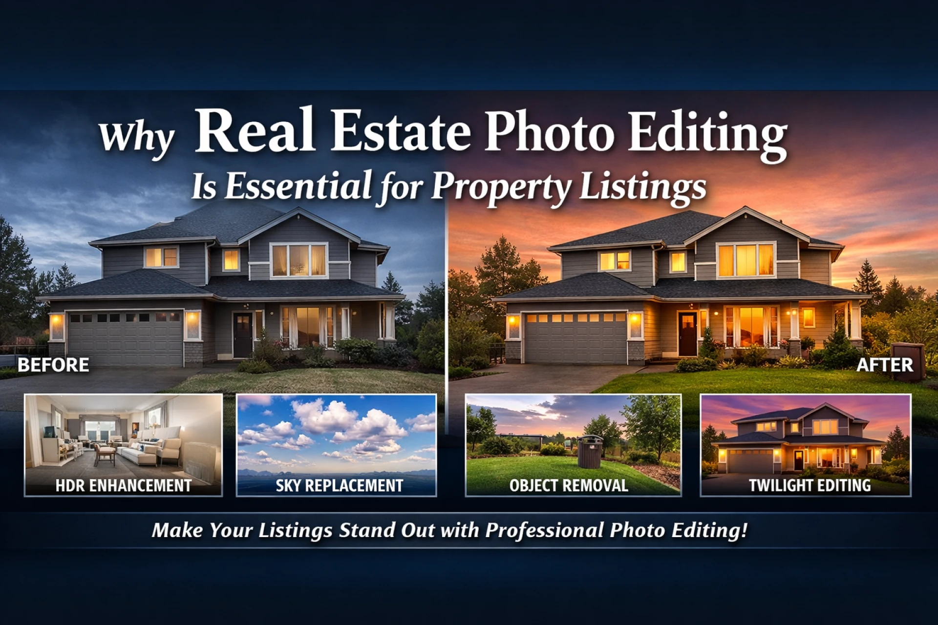 Real estate photo editing plays a crucial role in making property listings more attractive and professional. High-quality edited images enhance lighting, colors, and details, helping properties stand out online. Professional editing also removes distractions, improves visual appeal, and highlights the best features of a property. This increases buyer interest, generates more inquiries, and helps real estate agents and photographers market properties more effectively.