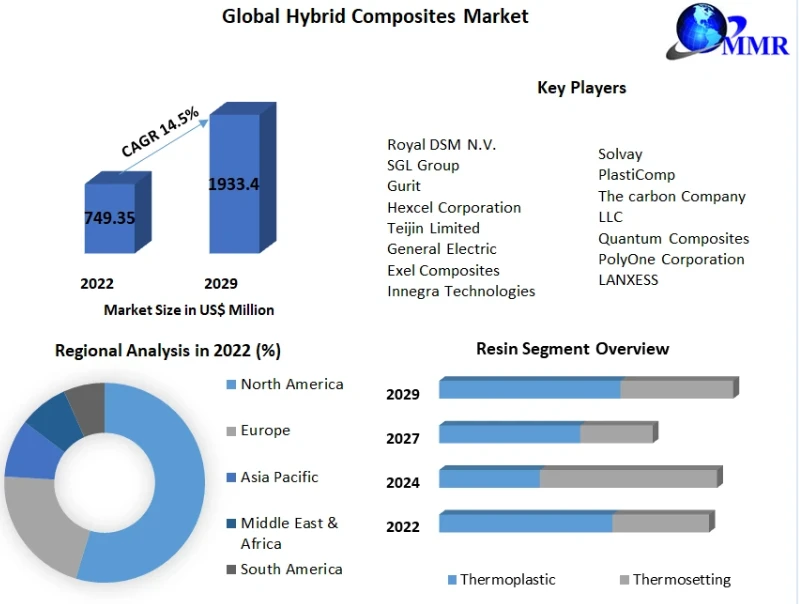 Hybrid Composites Market was valued at US$ 749.35 Mn in 2022 and is expected to reach US$ 1933.44 Mn by 2029, at a CAGR of 14.50% during a forecast period.