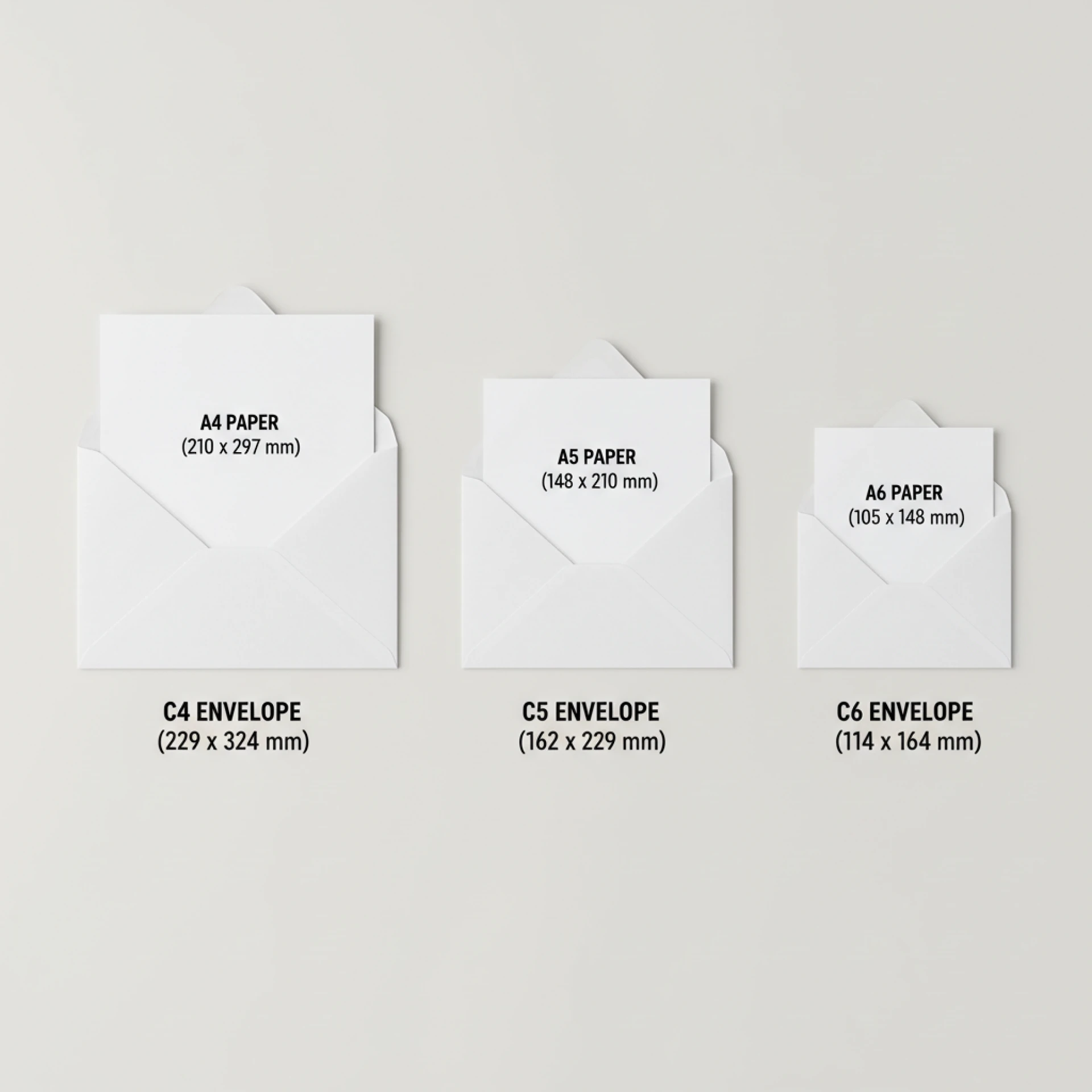 A C5 envelope is perfect for A5 paper, while a C4 envelope is ideal for A4 paper. A C6 envelope works for A4 paper folded into quarters, A5 paper fold