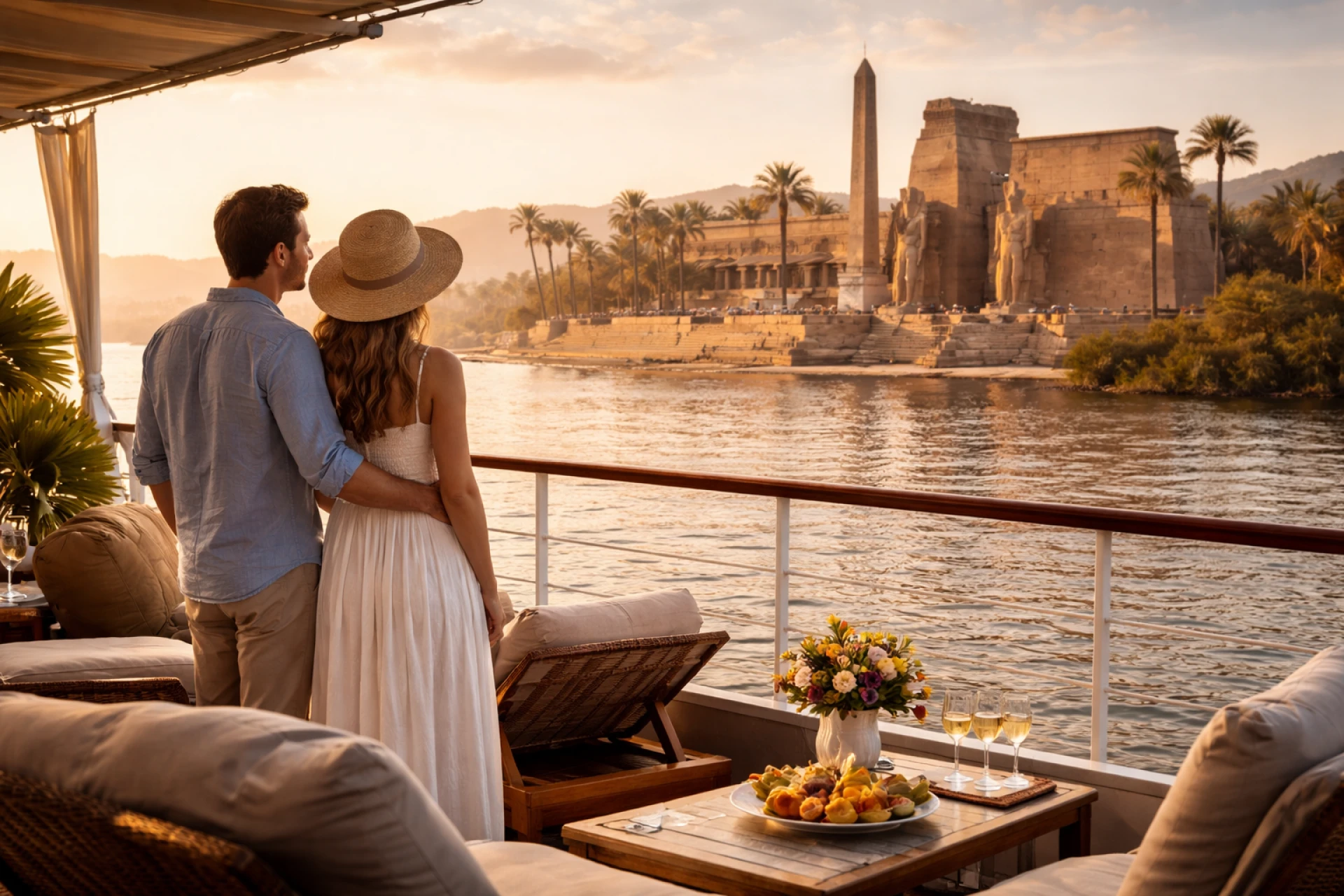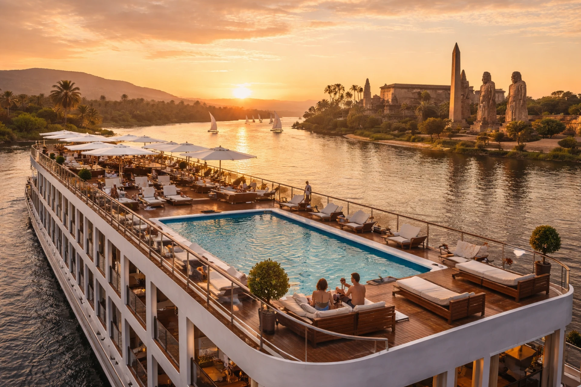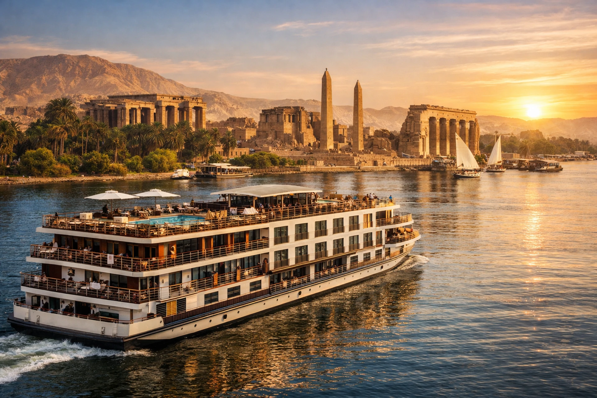 A breathtaking sunset scene captures the essence of an Egypt Nile River cruise luxury experience, where elegant ships glide past timeless temples and golden desert landscapes. Combining five-star comfort with iconic heritage along the Nile, this journey offers a refined way to explore Upper Egypt between Luxor and Aswan while enjoying panoramic river views and unforgettable cultural moments.