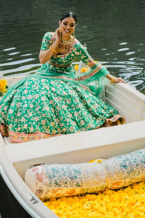 Exquisite green raw silk lehenga set adorned with intricate embroidery and elegant detailing.