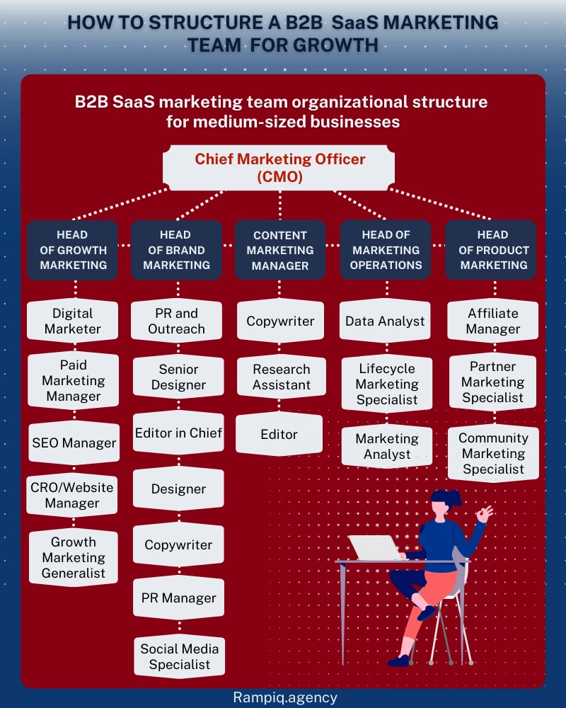 Medium-sized SaaS companies have more customers than small businesses and can afford to employ a few more people on their SaaS marketing teams than smaller businesses.However, they cannot hire enough people to warrant getting multiple people for specific roles, such as account managers or customer success managers (CSMs).Most companies of this size use a hybrid approach, where one person at the top oversees all aspects of marketing but doesn’t necessarily have the time or specialized skills to do everything themselves.