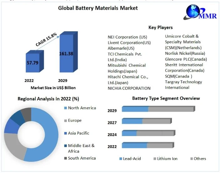 Battery Materials Market was valued at USD 57.79 Billion in 2022, and it is expected to reach USD 161.38 Billion by 2029, exhibiting a CAGR of 15.8 % during the forecast period (2023-2029)