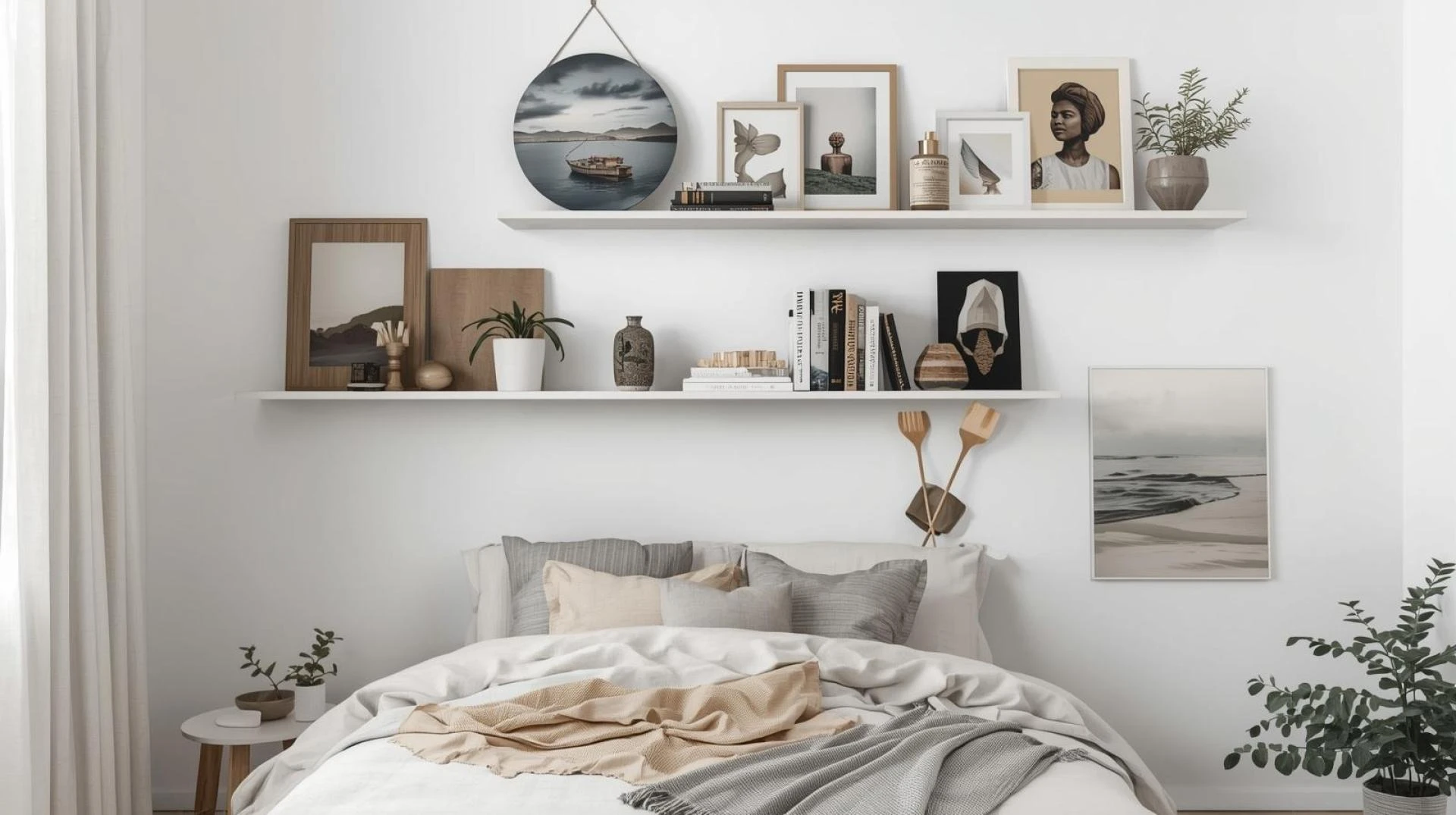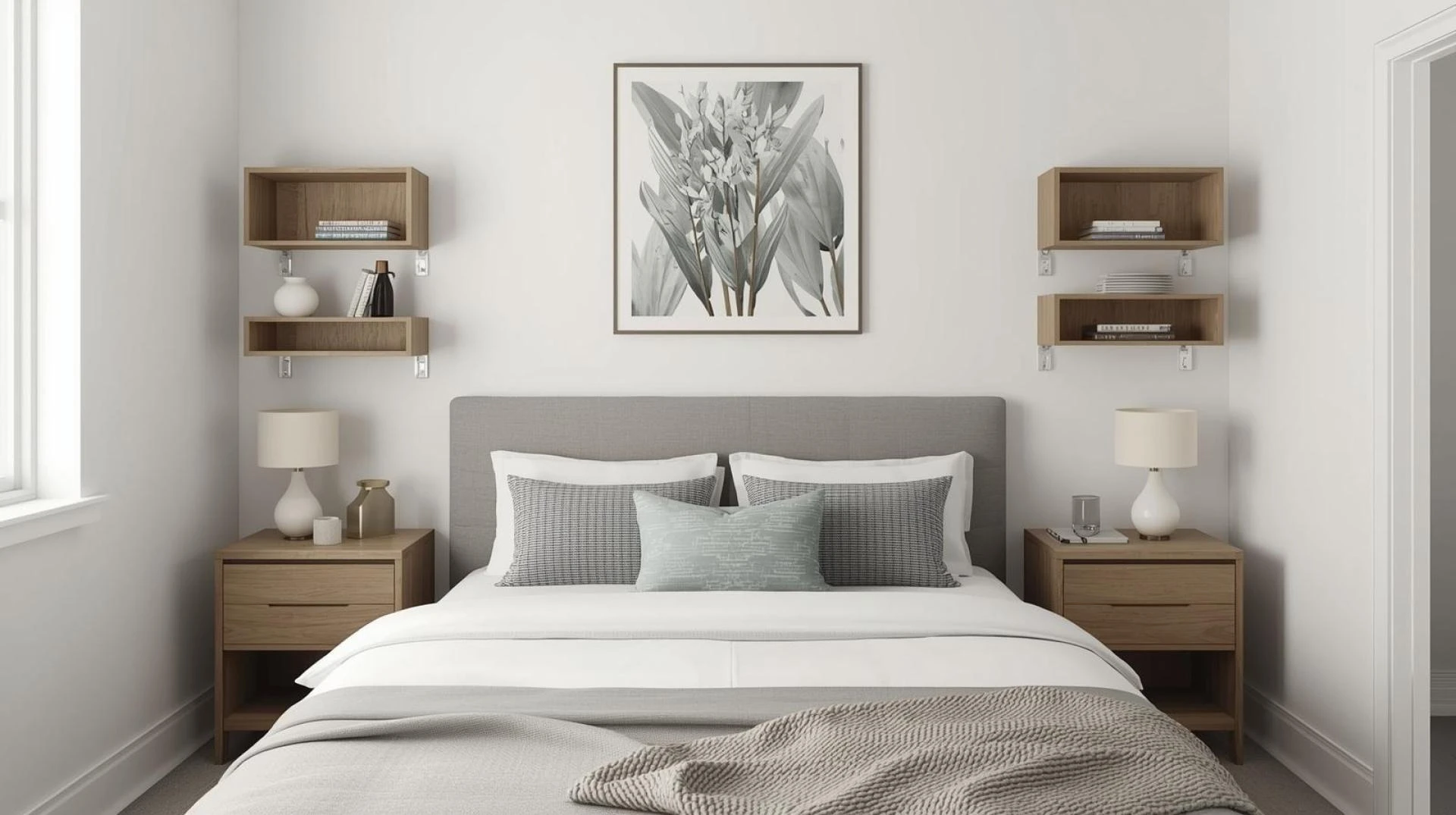 Instead of bulky side tables, choose ones with drawers or open shelving. Ladder-style shelves, nesting tables, or wall-mounted nightstands work perfectly in tight spaces. They help keep your nightly essentials organized and contribute to a clean, modern look.