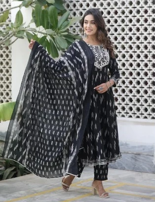 In conclusion, anyone who appreciates elegance, comfort, and versatility has to own the black patterned Kalidar kurta pant set from Radhey Collections with a printed mal dupatta. It\'s a perfect fit, sophisticated detailing, and classic black color that make it suitable for many different situations. Don\'t pass up this chance to give your clothing a dash of sophistication and tradition. Purchase the most fashionable and fashionable black printed Kalidar kurta pant set right now, and turn heads wherever you go!