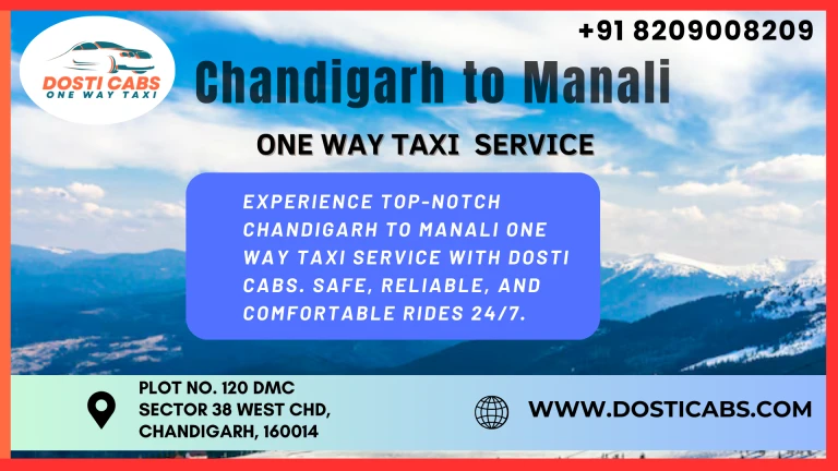 Traveling from Chandigarh to Manali with Dosti Cabs’ one way cab service guarantees a comfortable, safe, and enjoyable journey. With our professional drivers, well-maintained vehicles, competitive pricing, and excellent customer service, we are committed to making your travel experience exceptional. Whether you’re traveling for leisure or adventure, trust Dosti Cabs to provide the best transportation service. Book your ride today and experience the beauty of the Himalayas with ease and comfort.