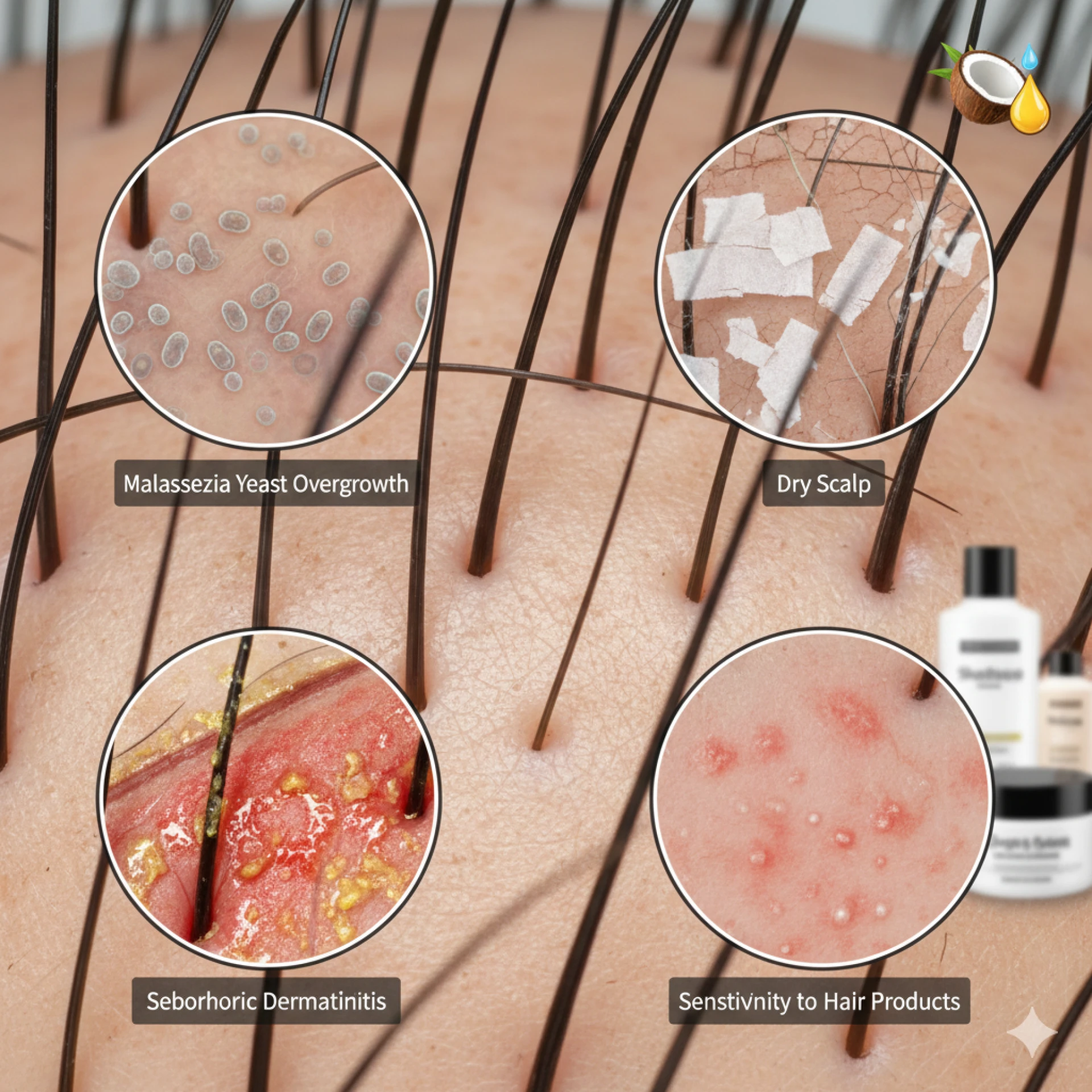 A yeast species known as Malassezia feeds on scalp sebum. When its population rises, inflammation begins, resulting in itching and flakes. This yeast thrives on certain lipids but is sensitive to others, which is why coconut oil helps calm the reaction.