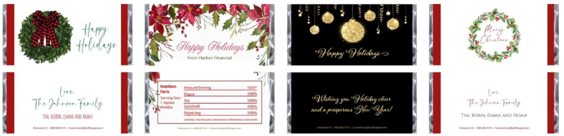 Check out Announce It! if you want to make personalized christmas candy bar wrappers. Since 1996, they have offered a wide choice of designs, easy ways to personalize them, and high-quality products. They can help you whether you need 25 or 250.