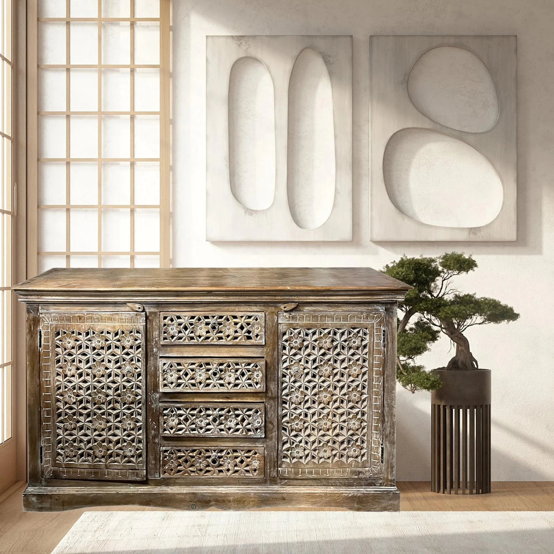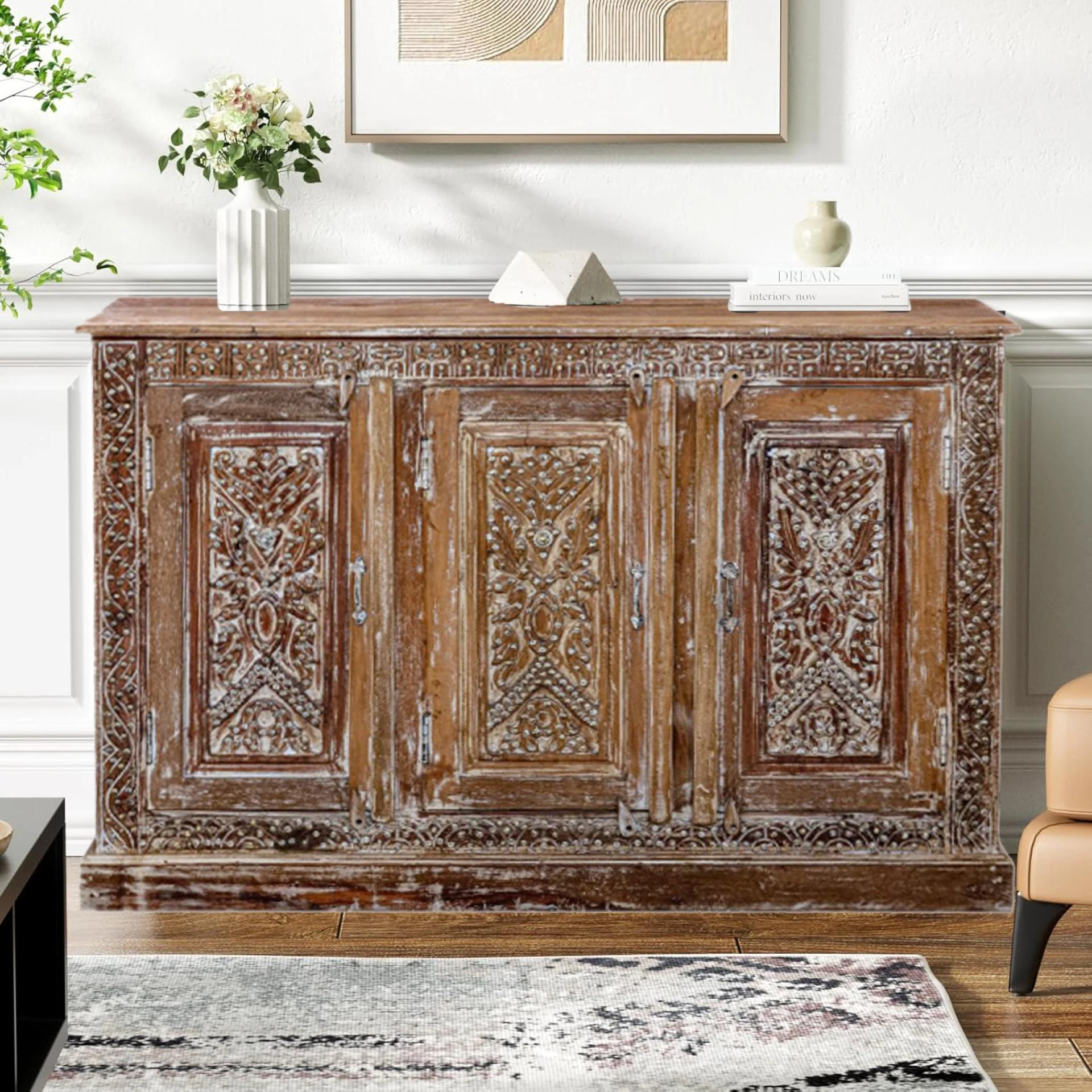 Sideboards and credenzas are perfect for those who prefer a subtle yet stylish approach to wine storage. Mogul Interiors' collection showcases intricately carved wooden sideboards with concealed storage, ideal for housing wine bottles, bar essentials, and dinnerware. The aged teak and distressed finishes enhance the ambiance of dining rooms and lounges, making them both practical and aesthetically pleasing.