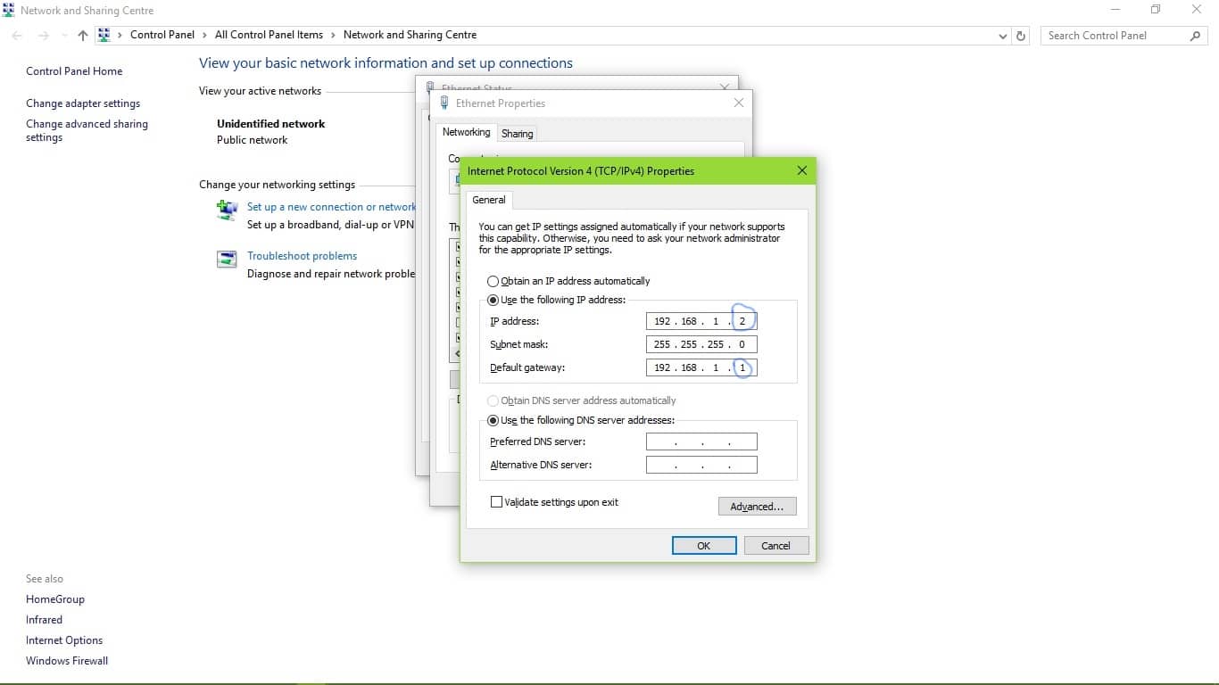 7) Now apply all the above process to the other PC. But alter the IP Address and Default Gateway.