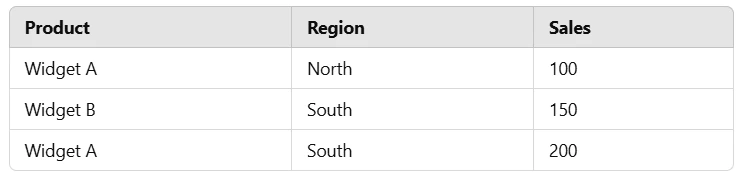 To find sales for “Widget A” in the “South” region: