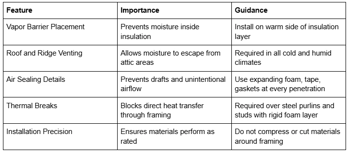 Moisture buildup also contributes to heat loss. Wet insulation doesn’t insulate. Condensation on metal panels, trapped humidity, or poor ventilation will reduce the effectiveness of your system, cause premature failure of materials, and lead to mold or rot issues over time.