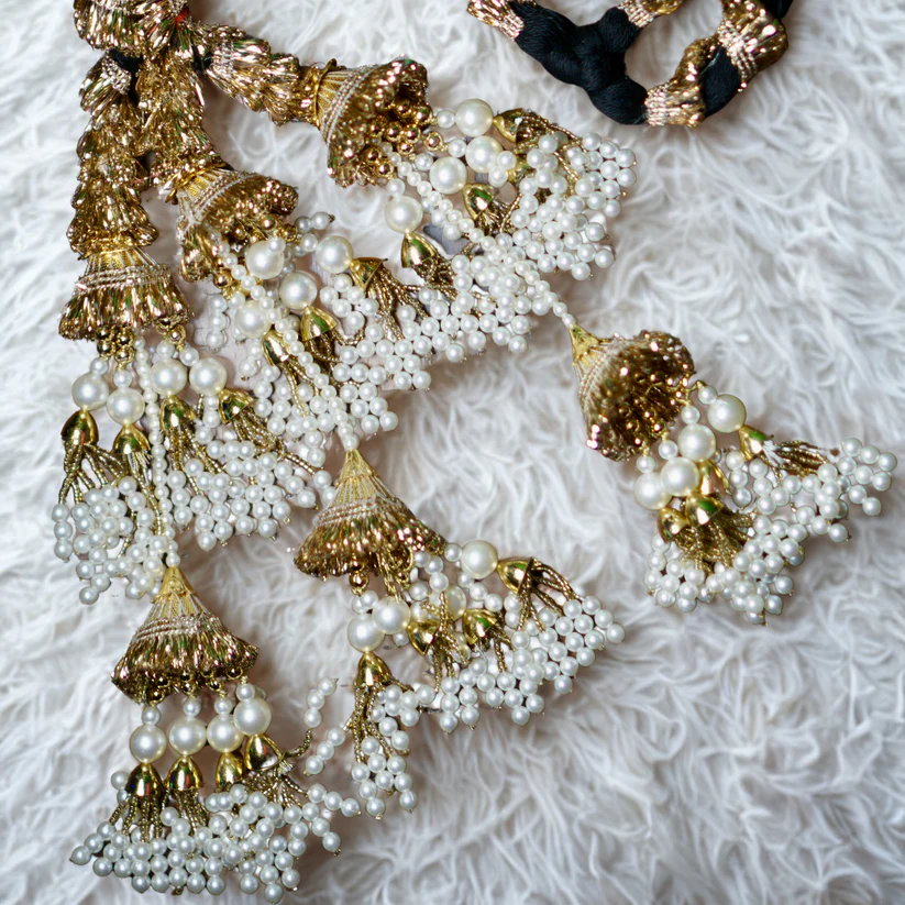 A bride adorned with a paranda looks regal and culturally rooted. Paired with a vibrant salwar suit or lehenga, the pearl tassels add a subtle royal touch.