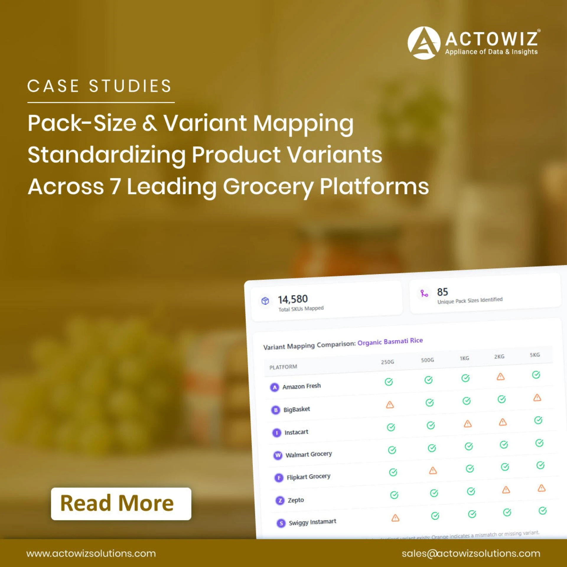 In today’s competitive digital grocery ecosystem, consistent product representation across platforms is critical for accurate pricing, assortment planning, and consumer trust. Grocery platforms often list the same product in multiple pack sizes, weights, or formats, making comparisons complex and error-prone. This case study explores how Actowiz Solutions successfully implemented Pack-Size & Variant Mapping to standardize product variants across seven leading grocery platforms.