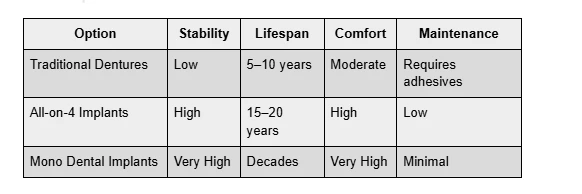 Compared to dentures and even All-on-4 implants, Mono Dental Implants provide superior support, longevity, and optimal bite distribution, making them particularly effective for full-arch restorations.