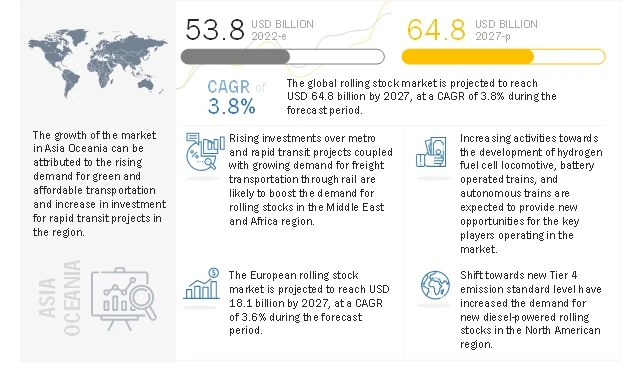 The global Rolling Stock Market was valued at USD 53.8 billion in 2022 and expected to reach USD 64.8 billion by 2027 and grow at a CAGR of 3.8% over the forecast period (2022 – 2027). The growth of the market can be attributed to the factors such as increasing urbanization, increasing traffic congestion, rising demand for comfortable journey and growing preference for shorter journey time. Moreover, The demand for rolling stocks is dependent on some other factors such as the replacement of old rolling stocks, new railway projects, and the expansion of railway routes. Apart from this, the increasing electrification of railway networks is also expected to foster the growth of the market globally.