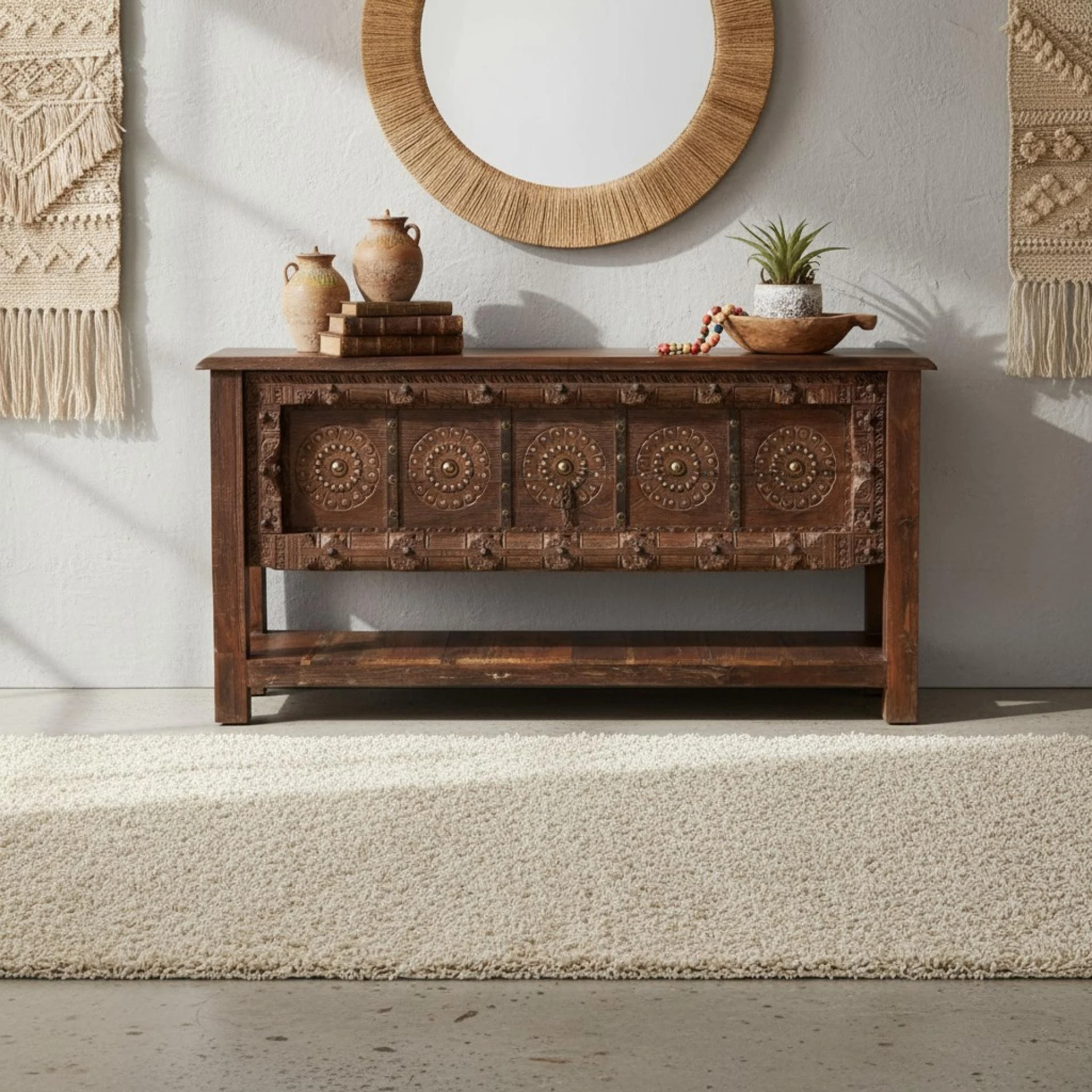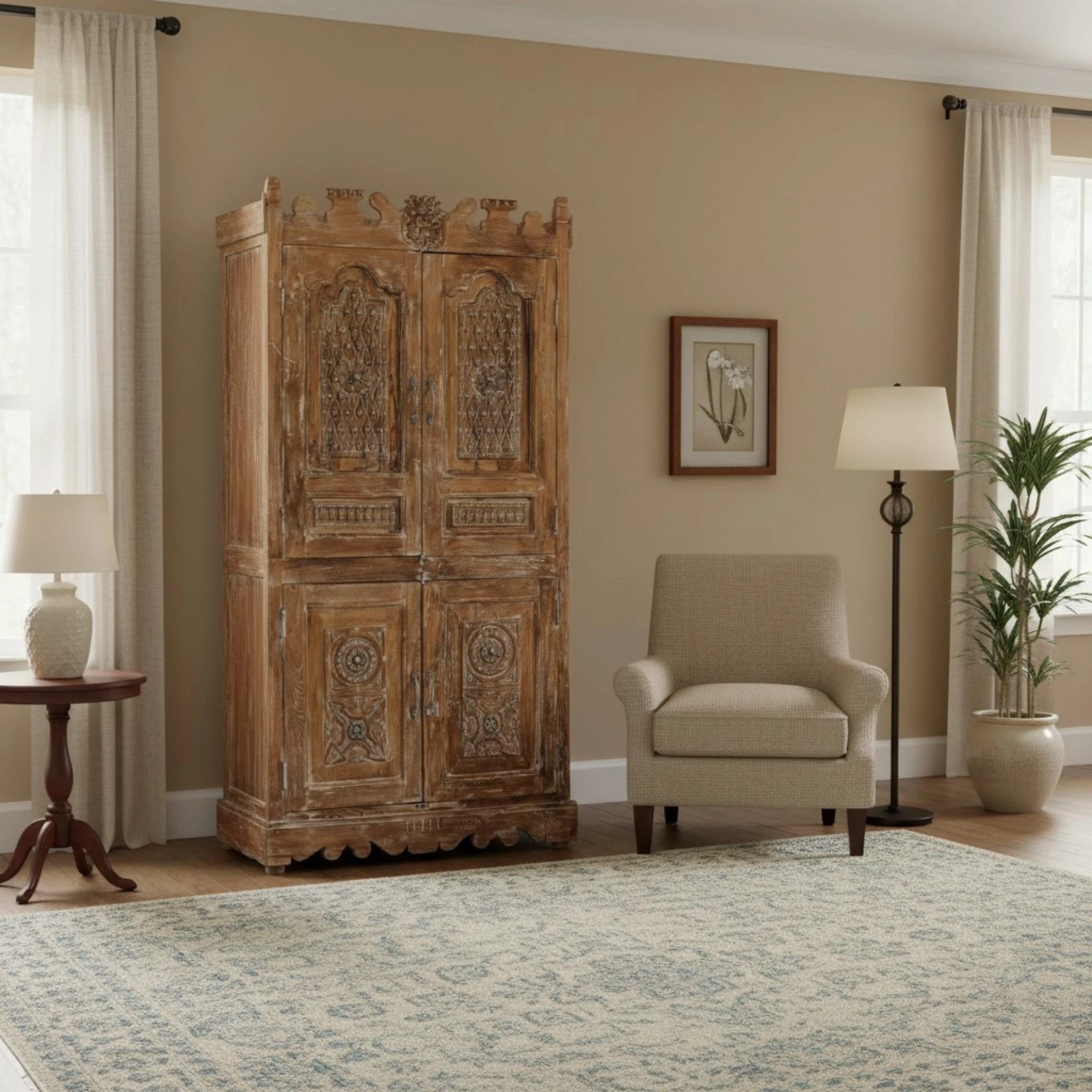 What sets this farmhouse apart is its ability to seamlessly blend disparate styles and influences through the thoughtful use of statement architectural doors, antique carved wooden doors, and vintage Indian door panels, creating a harmonious tapestry of design that feels both curated and effortless. It’s a space where every corner invites exploration—arched doorways become focal points, reclaimed doors add history and texture, and hand-carved details spark conversation—standing as a true testament to the power of eclectic design and soulful, Old World craftsmanship.