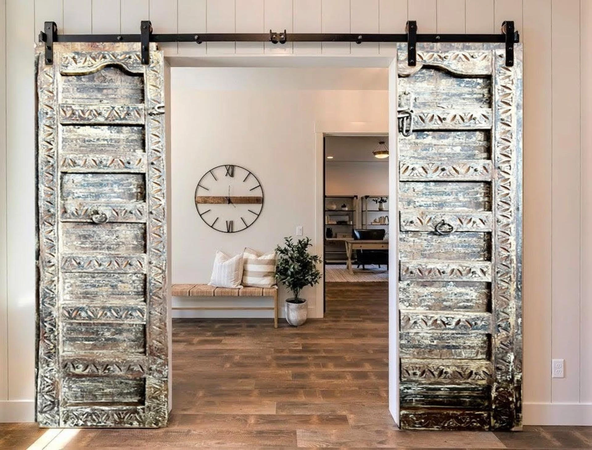 Adorn the interiors with carefully selected whitewashed reclaimed wood furniture. Each piece tells a story, showcasing the beauty of age and history.Incorporate a combination of whitewashed wooden tables, chairs, bed frames, and cabinets for a cohesive and serene ambiance.
