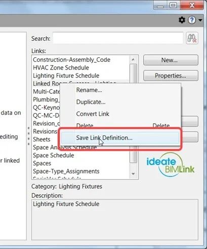 Links based on Revit Key Schedules are unique to a particular Revit project, and you CAN’T save them to an external link definition file. Instead, use the Revit “Insert from File” method to transfer a Key Schedule between projects, and then use By Schedule to create a new link based on this version of the key schedule.