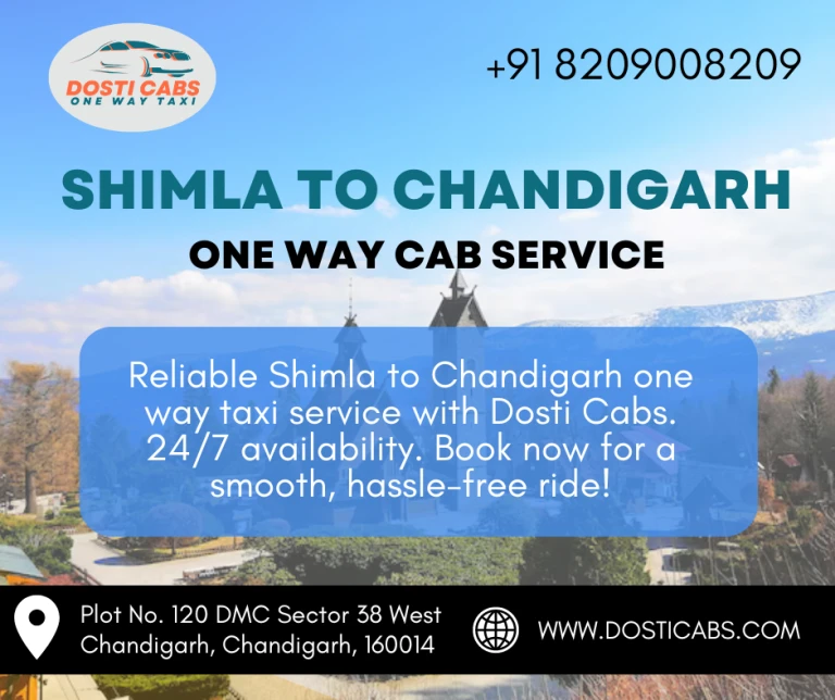 with Dosti Cabs. Our professional drivers ensure a safe and comfortable journey in well-maintained vehicles. Enjoy the scenic route from Shimla to Chandigarh without the hassle of driving. We offer competitive pricing with no hidden charges, making your trip affordable and stress-free. Our 24/7 availability and easy booking process ensure you can travel at your convenience. Whether it’s an early morning departure or a late-night trip, we are here to serve you. Trust Dosti Cabs for a reliable, efficient, and enjoyable travel experience. Book your Shimla to Chandigarh one way taxi today and travel with peace of mind.