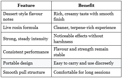 The inclusion of FVKD Live Rosin enhances the blend in several ways. First, it contributes to a more authentic terpene expression, giving the Space Cake vape its layered, dessert-like character. Second, it supports consistent taste throughout the cartridge. Rather than losing flavour strength midway, the rosin keeps it stable. Third, users often appreciate how clean the production method is, since it holds onto more natural plant compounds. This improves not only the taste but also the smoothness, especially for those who are sensitive to harsh finishes.