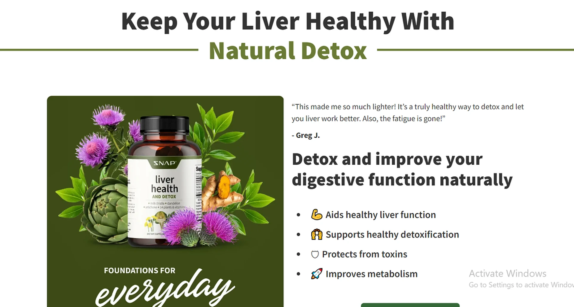 - John D.: “After taking Snap Liver Support Capsules for a month, I noticed a significant improvement in my digestion and energy levels. My liver enzyme levels have also normalized, which is a great relief.”
