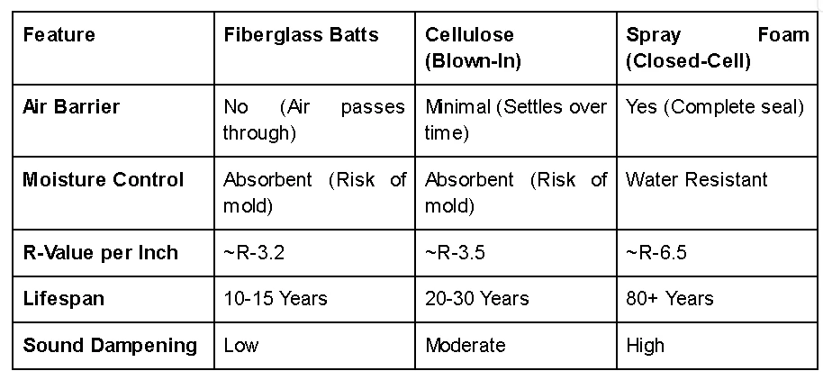 The following table compares how different insulation types perform against modern efficiency metrics: