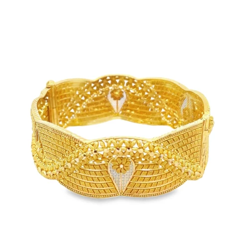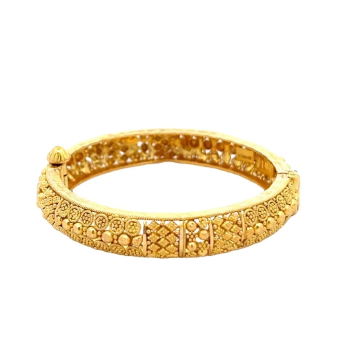 These bangles are delicate and have detailed work; filigree work is a style mark of vintage jewellery work. These are the bangles that feature fine, twisted gold threads shaped into floral themes. There are modern versions that have charm, but they are designed with slim profiles made to suit today’s minimalistic look. The fine work on filigree bangles is a popular choice for women who are interested in antique gold bangles with refined elegance.