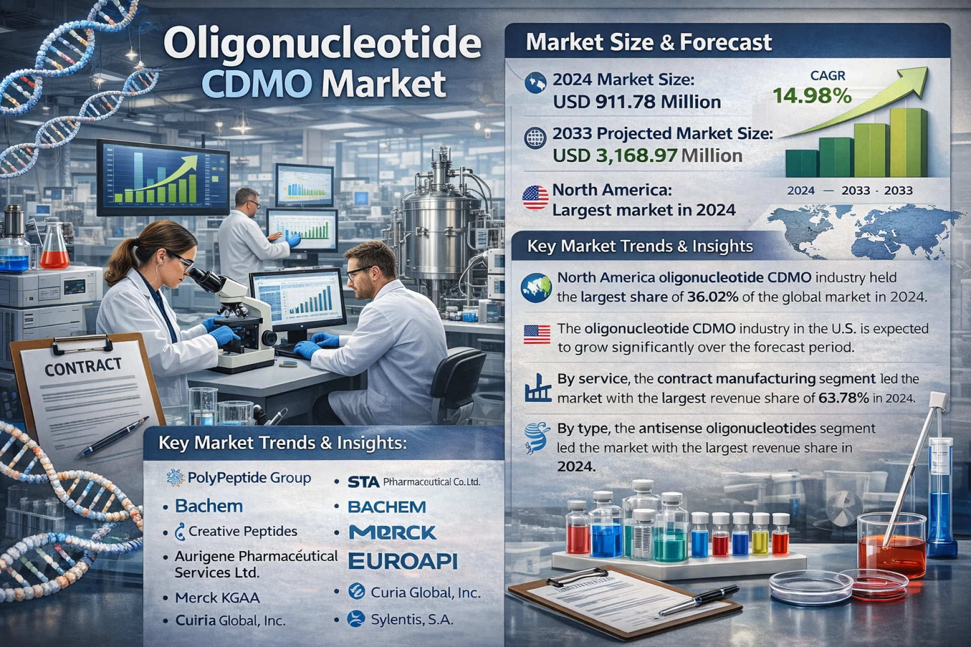 The global oligonucleotide CDMO market, valued at USD 911.78 million in 2024, is projected to skyrocket to USD 3,168.97 …