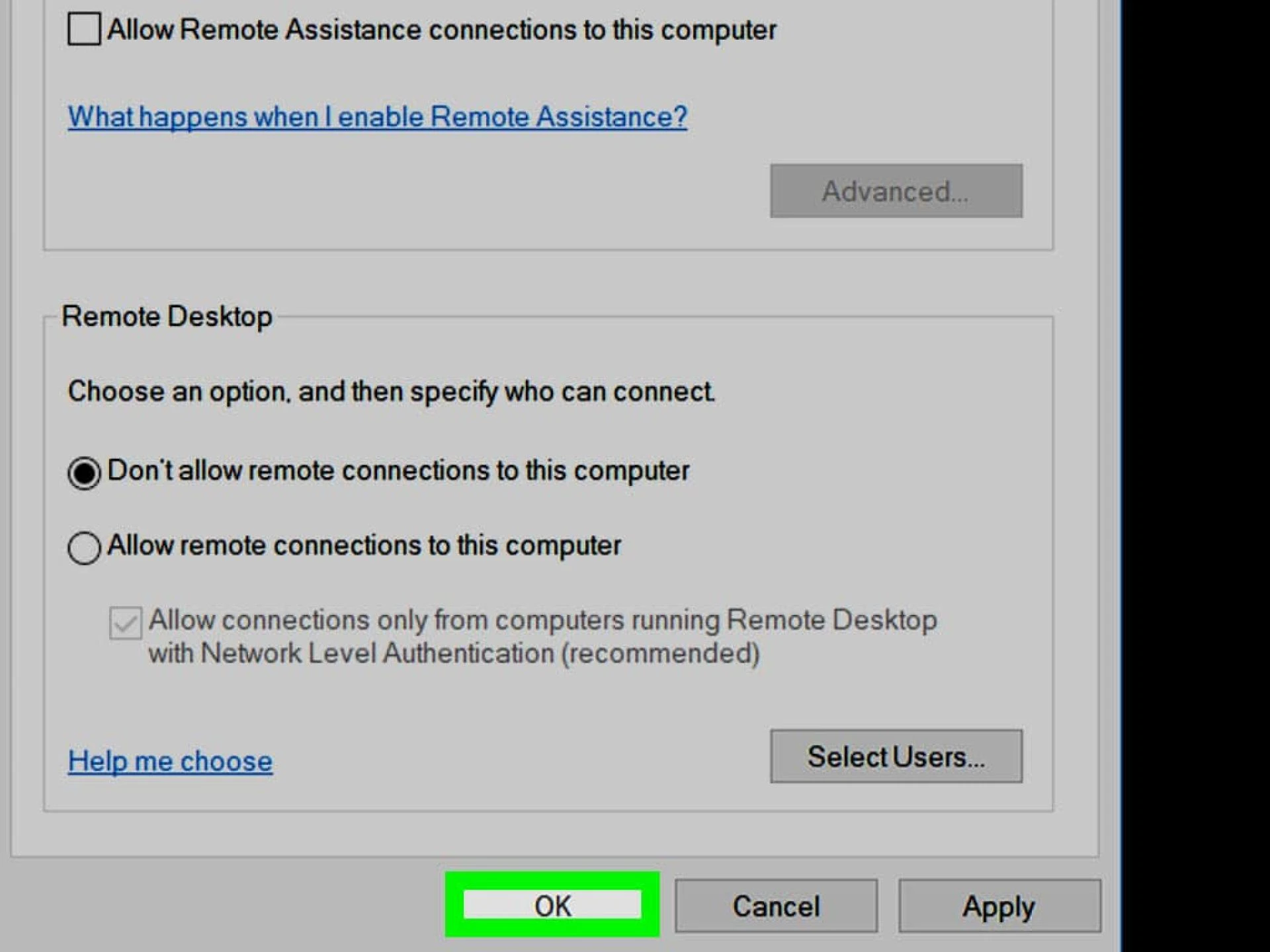 You can also disable Remote Desktop in Windows 10 using the System Properties window. You can click on the Settings app (Windows + I) app.The System Properties window will open, and choose the Remote tap that appears at your right and click on Don’t allow remote connections to this computer to enable.The System Properties window will open, and choose the Remote tap that appears at your right and click on Don’t allow remote connections to this computer to enable.Click on the OK button and close the System Properties window. Now, the Remote Desktop feature is disabled on your system.Disable Remote Desktop in Windows 7