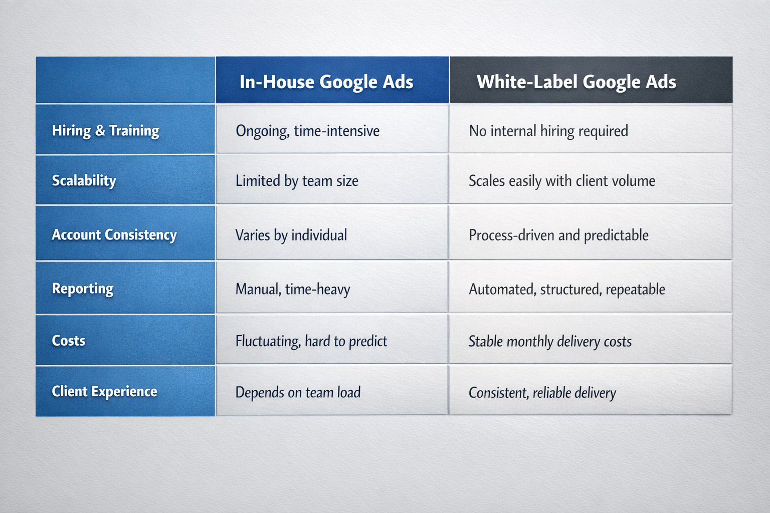 In-house Google Ads management isn’t inherently broken. It works well at low volume, when teams are small, and clients are few. But as agencies grow, the limitations of internal execution become clear-performance plateaus, operational costs rise, and team stress increases.